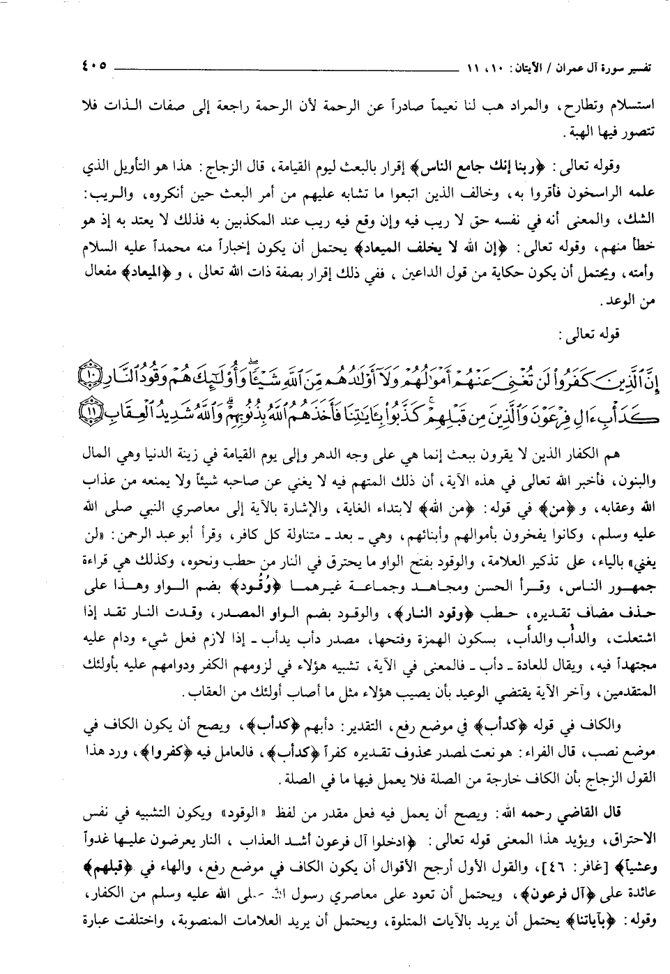 قال القاضي رحمه الله: ويصح أن يعمل فيه فعل مقدر من لفظ «الوقود» ويكون التشبيه في نفس الاحتراق، ويؤيد هذا المعنى قوله تعالى: أَدْخِلُوا آلَ فِرْعَوْنَ أَشَدَّ الْعَذابِ، النَّارُ يُعْرَضُونَ عَلَيْها غُدُوًّا وَعَشِيًّا [غافر: ٤٦] ، والقول الأول أرجح الأقوال أن يكون الكاف في موضع رفع، والهاء في قَبْلِهِمْ عائدة على آلِ فِرْعَوْنَ، ويحتمل أن تعود على معاصري رسول الله صلى الله عليه وسلم من الكفار، وقوله: بِآياتِنا يحتمل أن يريد بالآيات المتلوة، ويحتمل أن يريد العلامات المنصوبة، واختلفت عبارة