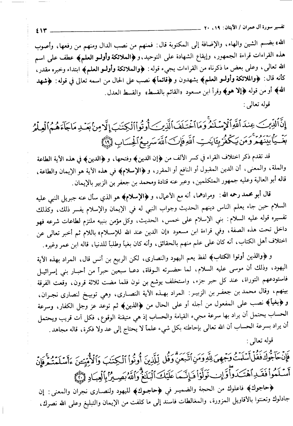 قال أبو محمد رحمه الله: ومرادهما، أنه مع الأعمال، والْإِسْلامُ هو الذي سأل عنه جبريل النبي عليه السلام حين جاء يعلم الناس دينهم الحديث وجواب النبي له في الإيمان والإسلام يفسر ذلك، وكذلك تفسيره قوله عليه السلام: بني الإسلام على خمس، الحديث، وكل مؤمن بنبيه ملتزم لطاعات شرعه فهو داخل تحت هذه الصفة، وفي قراءة ابن مسعود «إن الدين عند الله للإسلام» باللام ثم أخبر تعالى عن اختلاف أهل الكتاب، أنه كان على علم منهم بالحقائق، وأنه كان بغيا وطلبا للدنيا، قاله ابن عمر وغيره.
