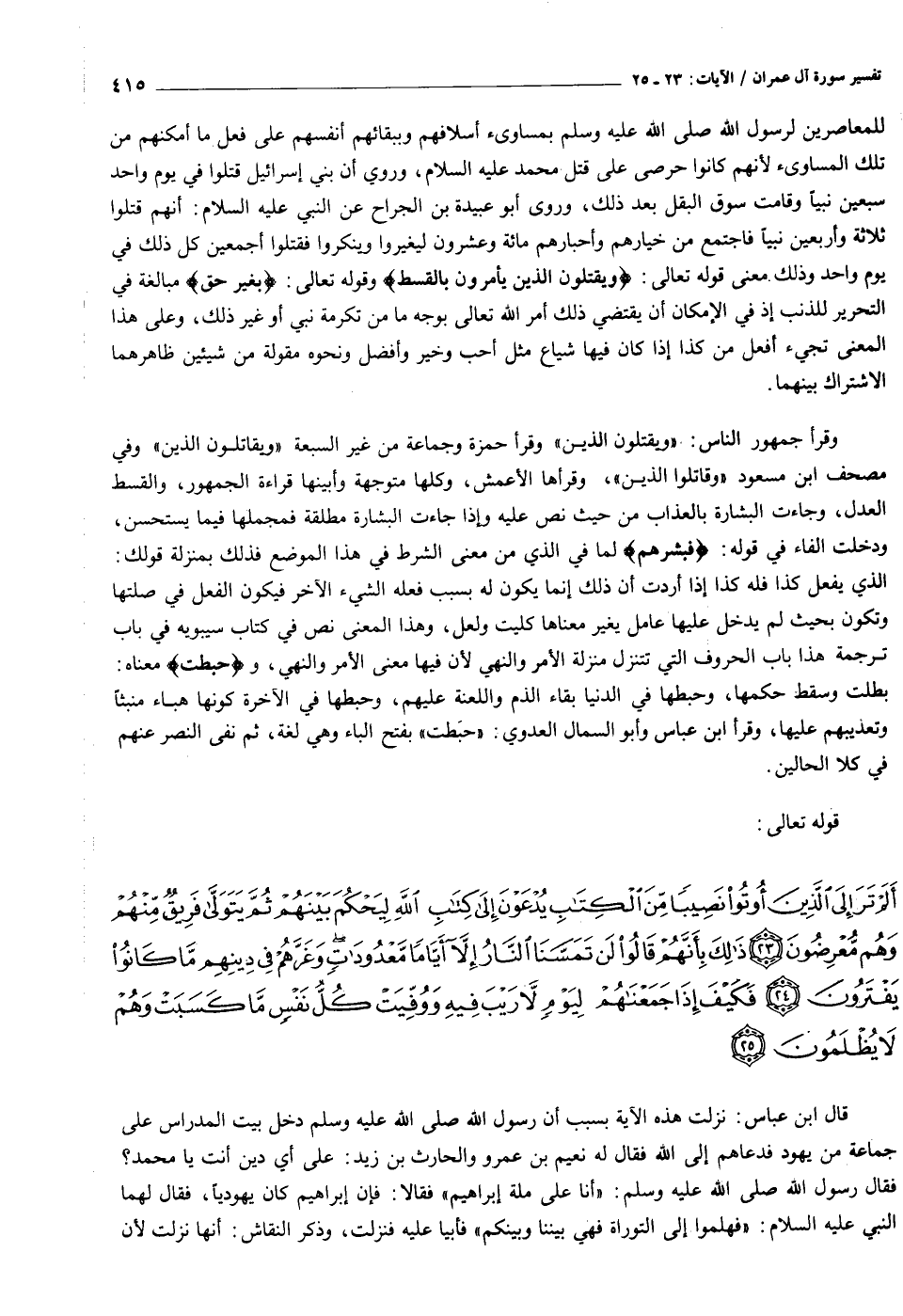 أَلَمْ تَرَ إِلَى الَّذِينَ أُوتُوا نَصِيباً مِنَ الْكِتابِ يُدْعَوْنَ إِلى كِتابِ اللَّهِ لِيَحْكُمَ بَيْنَهُمْ ثُمَّ يَتَوَلَّى فَرِيقٌ مِنْهُمْ وَهُمْ مُعْرِضُونَ (٢٣) ذلِكَ بِأَنَّهُمْ قالُوا لَنْ تَمَسَّنَا النَّارُ إِلاَّ أَيَّاماً مَعْدُوداتٍ وَغَرَّهُمْ فِي دِينِهِمْ ما كانُوا يَفْتَرُونَ (٢٤) فَكَيْفَ إِذا جَمَعْناهُمْ لِيَوْمٍ لا رَيْبَ فِيهِ وَوُفِّيَتْ كُلُّ نَفْسٍ ما كَسَبَتْ وَهُمْ لا يُظْلَمُونَ (٢٥)