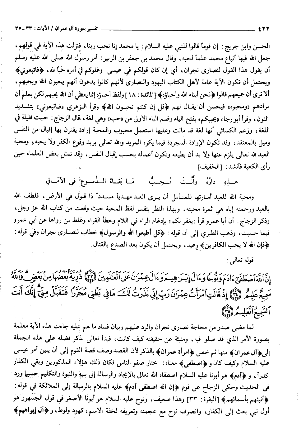 إِنَّ اللَّهَ اصْطَفى آدَمَ وَنُوحاً وَآلَ إِبْراهِيمَ وَآلَ عِمْرانَ عَلَى الْعالَمِينَ (٣٣) ذُرِّيَّةً بَعْضُها مِنْ بَعْضٍ وَاللَّهُ سَمِيعٌ عَلِيمٌ (٣٤) إِذْ قالَتِ امْرَأَتُ عِمْرانَ رَبِّ إِنِّي نَذَرْتُ لَكَ ما فِي بَطْنِي مُحَرَّراً فَتَقَبَّلْ مِنِّي إِنَّكَ أَنْتَ السَّمِيعُ الْعَلِيمُ (٣٥)