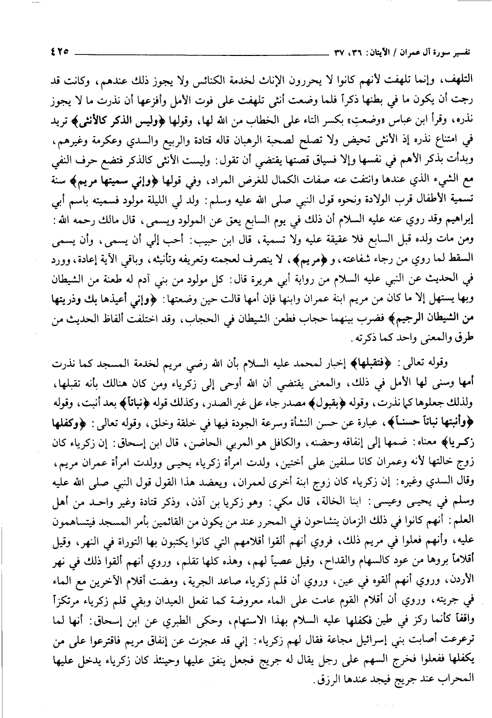 وقوله تعالى: فَتَقَبَّلَها إخبار لمحمد عليه السلام بأن الله رضي مريم لخدمة المسجد كما نذرت أمها وسنى لها الأمل في ذلك، والمعنى يقتضي أن الله أوحى إلى زكرياء ومن كان هنالك بأنه تقبلها، ولذلك جعلوها كما نذرت، وقوله بِقَبُولٍ مصدر جاء على غير الصدر، وكذلك قوله نَباتاً بعد أنبت، وقوله وَأَنْبَتَها نَباتاً حَسَناً، عبارة عن حسن النشأة وسرعة الجودة فيها في خلقة وخلق، وقوله تعالى: وَكَفَّلَها زَكَرِيَّا معناه: ضمها إلى إنفاقه وحضنه، والكافل هو المربي الحاضن، قال ابن إسحاق: إن زكرياء كان زوج خالتها لأنه وعمران كانا سلفين على أختين، ولدت امرأة زكرياء يحيى وولدت امرأة عمران مريم، وقال السدي وغيره: إن زكرياء كان زوج ابنة أخرى لعمران، ويعضد هذا القول قول النبي صلى الله عليه وسلم في يحيى وعيسى: ابنا الخالة، قال مكي: وهو زكريا بن آذن، وذكر قتادة وغير واحد من أهل العلم: أنهم كانوا في ذلك الزمان يتشاحون في المحرر عند من يكون من القائمين بأمر المسجد فيتساهمون عليه، وأنهم فعلوا في مريم ذلك، فروي أنهم ألقوا أقلامهم التي كانوا يكتبون بها التوراة في النهر، وقيل أقلاما بروها من عود كالسهام والقداح، وقيل عصيا لهم، وهذه كلها تقلم، وروي أنهم ألقوا ذلك في نهر الأردن، وروي أنهم ألقوه في عين، وروي أن قلم زكرياء صاعد الجرية، ومضت أقلام الآخرين مع الماء في جريته، وروي أن أقلام القوم عامت على الماء معروضة كما تفعل العيدان وبقي قلم زكرياء مرتكزا واقفا كأنما ركز في طين فكفلها عليه السلام بهذا الاستهام، وحكى الطبري عن ابن إسحاق: أنها لما ترعرعت أصابت بني إسرائيل مجاعة فقال لهم زكرياء: إني قد عجزت عن إنفاق مريم فاقترعوا على من يكفلها ففعلوا فخرج السهم على رجل يقال له جريج فجعل ينفق عليها وحينئذ كان زكرياء يدخل عليها المحراب عند جريج فيجد عندها الرزق.