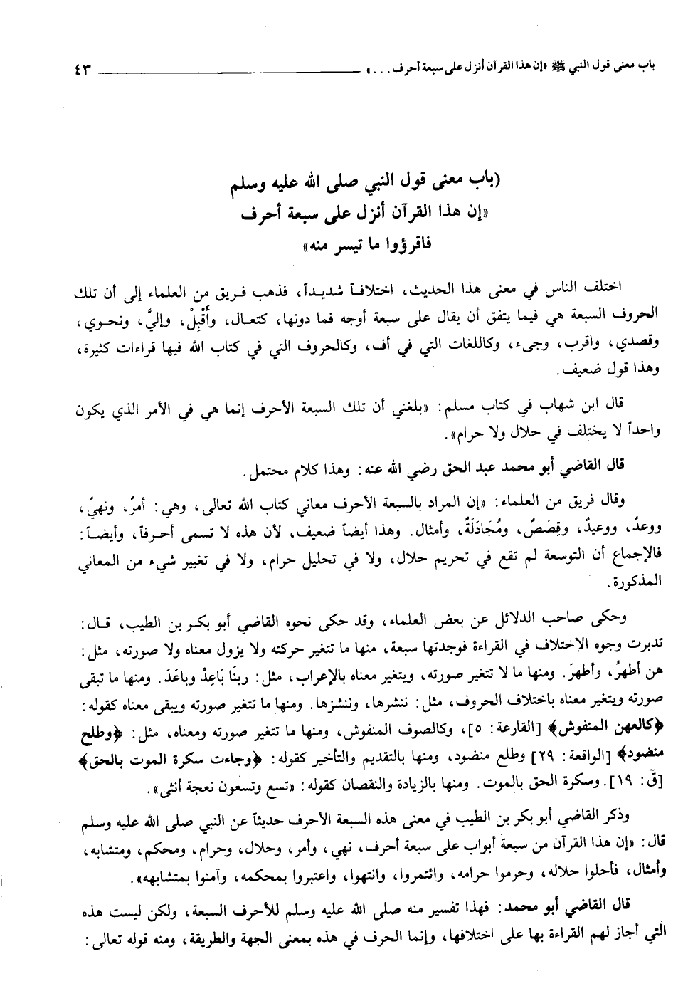 قال ابن شهاب في كتاب مسلم: «بلغني أن تلك السبعة الأحرف إنما هي في الأمر الذي يكون واحدا لا يختلف في حلال ولا حرام» .