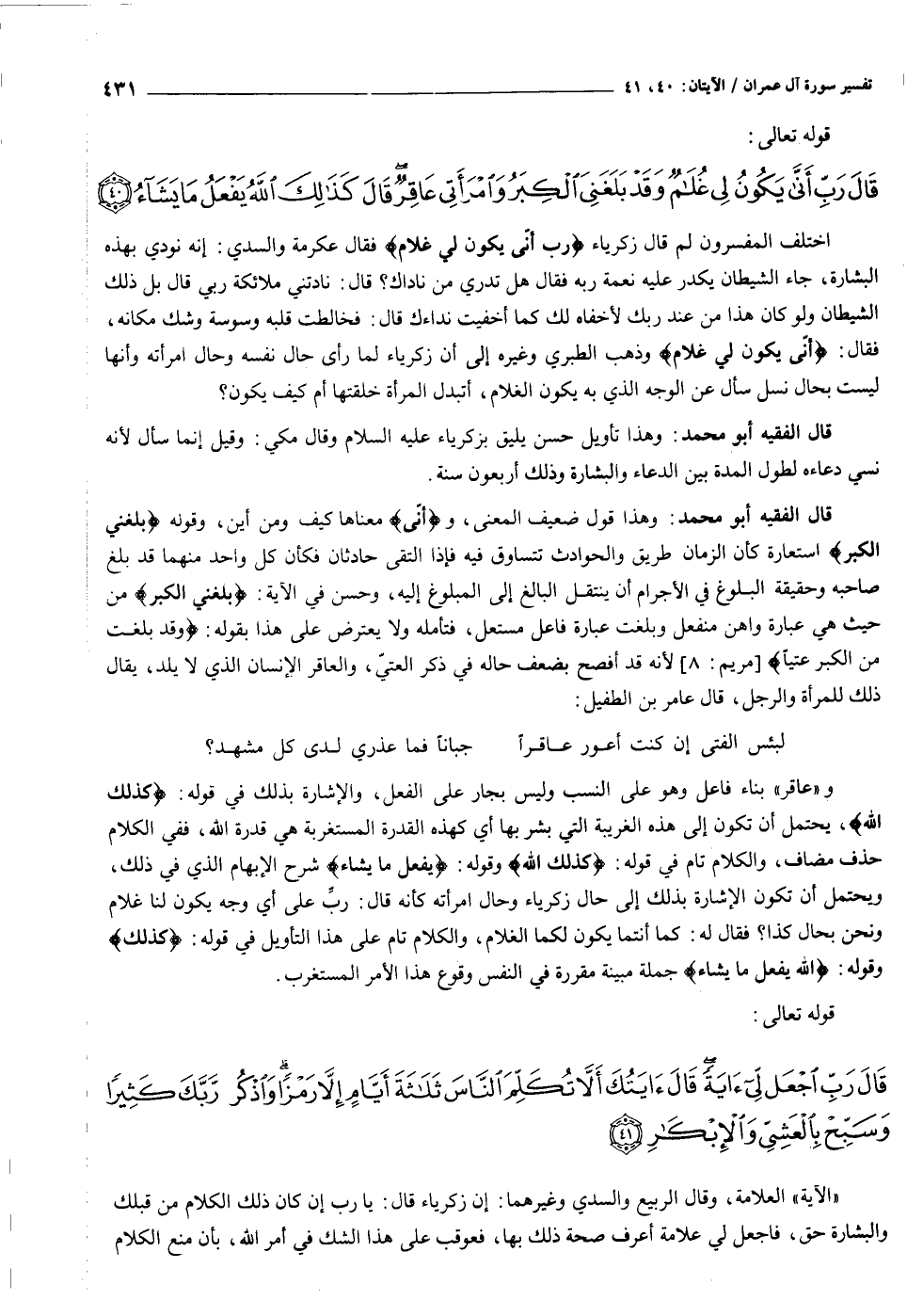 قالَ رَبِّ اجْعَلْ لِي آيَةً قالَ آيَتُكَ أَلاَّ تُكَلِّمَ النَّاسَ ثَلاثَةَ أَيَّامٍ إِلاَّ رَمْزاً وَاذْكُرْ رَبَّكَ كَثِيراً وَسَبِّحْ بِالْعَشِيِّ وَالْإِبْكارِ (٤١)