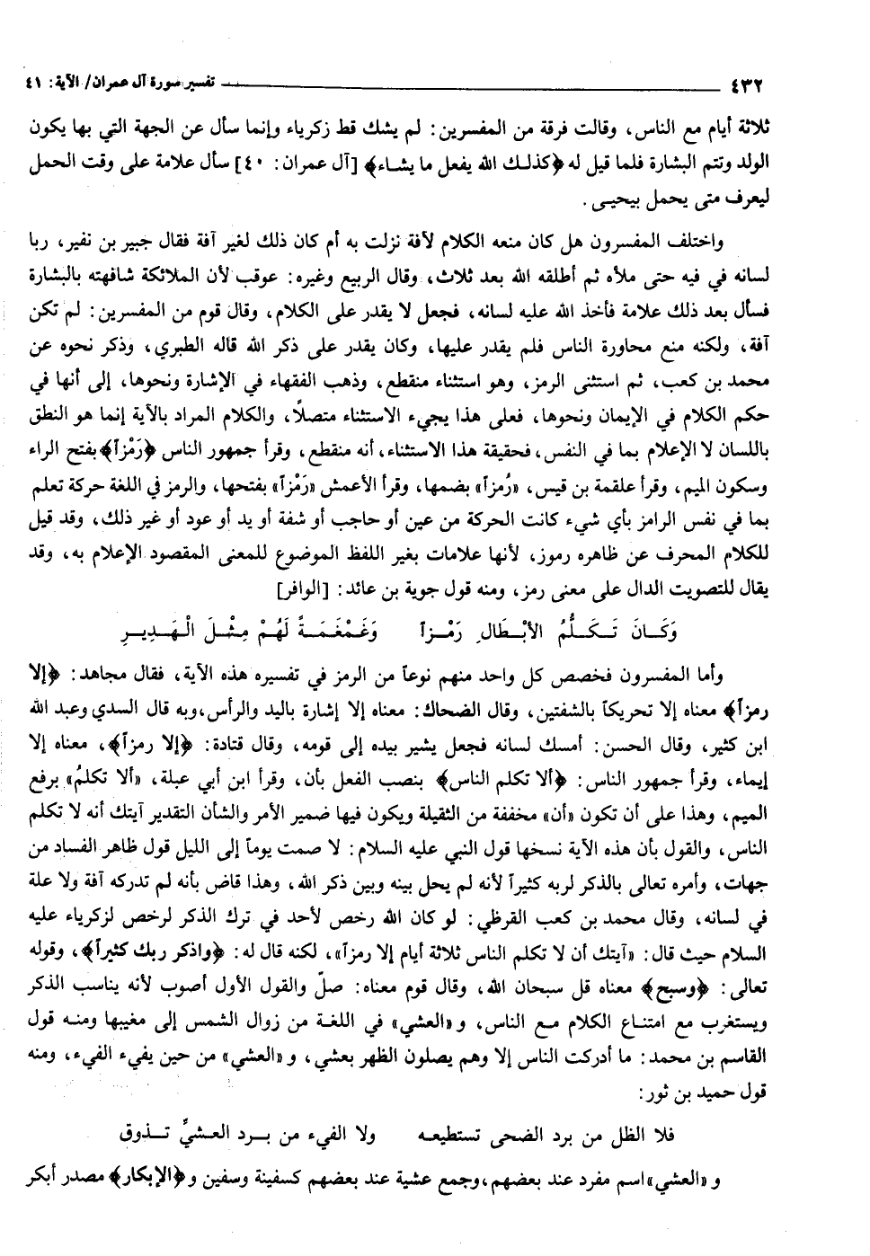 وأما المفسرون فخصص كل واحد منهم نوعا من الرمز في تفسيره هذه الآية، فقال مجاهد: إِلَّا رَمْزاً معناه إلا تحريكا بالشفتين، وقال الضحاك: معناه إلا إشارة باليد والرأس، وبه قال السدي وعبد الله ابن كثير، وقال الحسن: أمسك لسانه فجعل يشير بيده إلى قومه، وقال قتادة: إِلَّا رَمْزاً، معناه إلا إيماء، وقرأ جمهور الناس: أَلَّا تُكَلِّمَ النَّاسَ بنصب الفعل بأن، وقرأ ابن أبي عبلة، «ألا تكلم» برفع الميم، وهذا على أن تكون «أن» مخففة من الثقيلة ويكون فيها ضمير الأمر والشأن التقدير آيتك أنه لا تكلم الناس، والقول بأن هذه الآية نسخها قول النبي عليه السلام: لا صمت يوما إلى الليل قول ظاهر الفساد من جهات، وأمره تعالى بالذكر لربه كثيرا لأنه لم يحل بينه وبين ذكر الله، وهذا قاض بأنه لم تدركه آفة ولا علة في لسانه، وقال محمد بن كعب القرظي: لو كان الله رخص لأحد في ترك الذكر لرخص لزكرياء عليه السلام حيث قال: «آيتك أن لا تكلم الناس ثلاثة أيام إلا رمزا» ، لكنه قال له: وَاذْكُرْ رَبَّكَ كَثِيراً، وقوله تعالى: وَسَبِّحْ معناه قل سبحان الله، وقال قوم معناه: صلّ والقول الأول أصوب لأنه يناسب الذكر ويستغرب مع امتناع الكلام مع الناس، و «العشي» في اللغة من زوال الشمس إلى مغيبها ومنه قول القاسم بن محمد: ما أدركت الناس إلا وهم يصلون الظهر بعشي، و «العشي» من حين يفيء الفيء، ومنه قول حميد بن ثور: