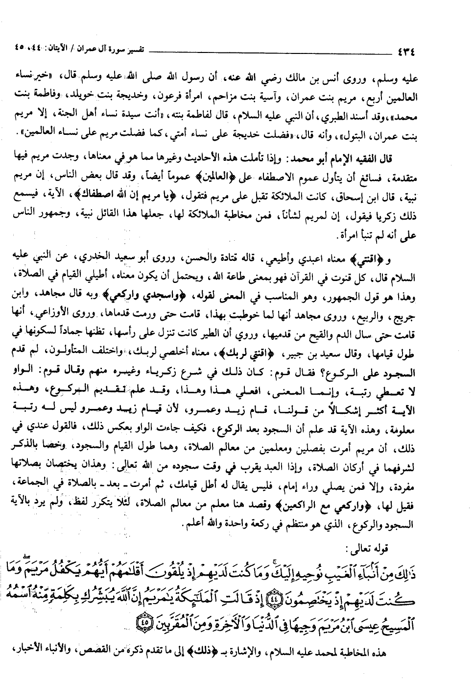 ذلِكَ مِنْ أَنْباءِ الْغَيْبِ نُوحِيهِ إِلَيْكَ وَما كُنْتَ لَدَيْهِمْ إِذْ يُلْقُونَ أَقْلامَهُمْ أَيُّهُمْ يَكْفُلُ مَرْيَمَ وَما كُنْتَ لَدَيْهِمْ إِذْ يَخْتَصِمُونَ (٤٤) إِذْ قالَتِ الْمَلائِكَةُ يا مَرْيَمُ إِنَّ اللَّهَ يُبَشِّرُكِ بِكَلِمَةٍ مِنْهُ اسْمُهُ الْمَسِيحُ عِيسَى ابْنُ مَرْيَمَ وَجِيهاً فِي الدُّنْيا وَالْآخِرَةِ وَمِنَ الْمُقَرَّبِينَ (٤٥)