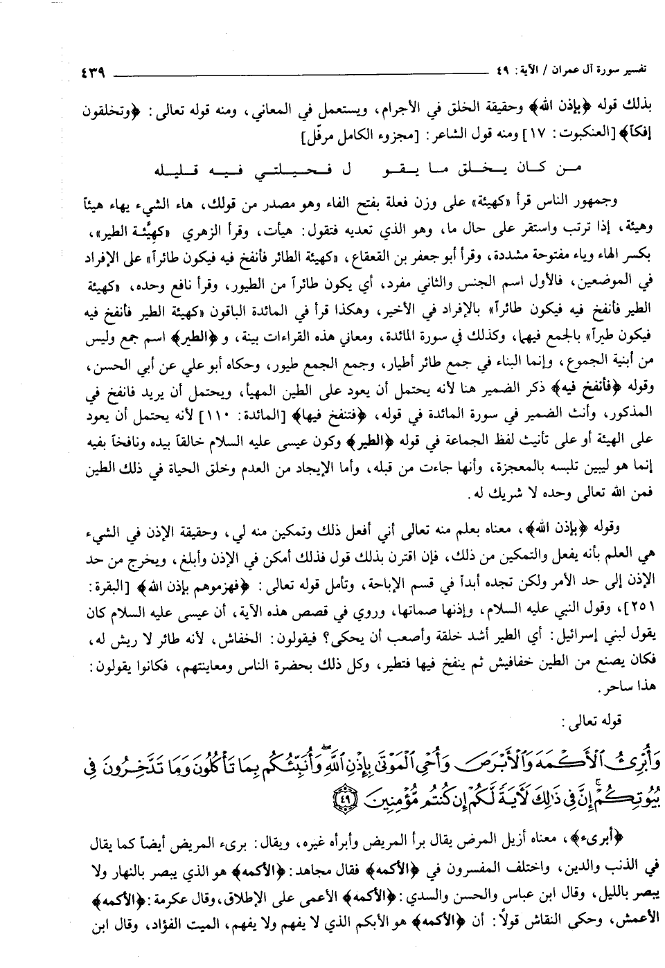 وجمهور الناس قرأ «كهيئة» على وزن فعلة بفتح الفاء وهو مصدر من قولك، هاء الشيء يهاء هيئا وهيئة، إذا ترتب واستقر على حال ما، وهو الذي تعديه فتقول: هيأت، وقرأ الزهري «كهيّئة الطير» ، بكسر الهاء وياء مفتوحة مشددة، وقرأ أبو جعفر بن القعقاع، «كهيئة الطائر فأنفخ فيه فيكون طائرا» على الإفراد في الموضعين، فالأول اسم الجنس والثاني مفرد، أي يكون طائرا من الطيور، وقرأ نافع وحده، «كهيئة الطير فأنفخ فيه فيكون طائرا» بالإفراد في الأخير، وهكذا قرأ في المائدة الباقون «كهيئة الطير فأنفخ فيه فيكون طيرا» بالجمع فيهما، وكذلك في سورة المائدة، ومعاني هذه القراءات بينة، والطَّيْرِ اسم جمع وليس من أبنية الجموع، وإنما البناء في جمع طائر أطيار، وجمع الجمع طيور، وحكاه أبو علي عن أبي الحسن، وقوله فَأَنْفُخُ فِيهِ ذكر الضمير هنا لأنه يحتمل أن يعود على الطين المهيأ، ويحتمل أن يريد فانفخ في المذكور، وأنث الضمير في سورة المائدة في قوله، فَتَنْفُخُ فِيها [المائدة: ١١٠] لأنه يحتمل أن يعود على الهيئة أو على تأنيث لفظ الجماعة في قوله الطَّيْرِ وكون عيسى عليه السلام خالقا بيده ونافخا بفيه إنما هو ليبين تلبسه بالمعجزة، وأنها جاءت من قبله، وأما الإيجاد من العدم وخلق الحياة في ذلك الطين فمن الله تعالى وحده لا شريك له.