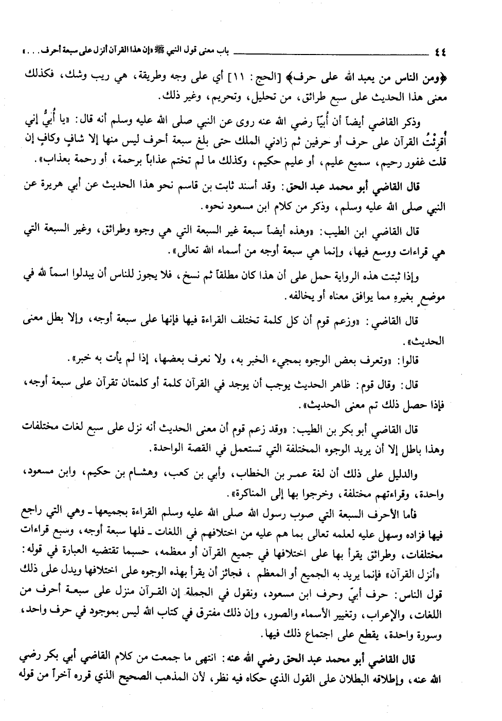 قال القاضي أبو بكر بن الطيب: «وقد زعم قوم أن معنى الحديث أنه نزل على سبع لغات مختلفات وهذا باطل إلا أن يريد الوجوه المختلفة التي تستعمل في القصة الواحدة.
