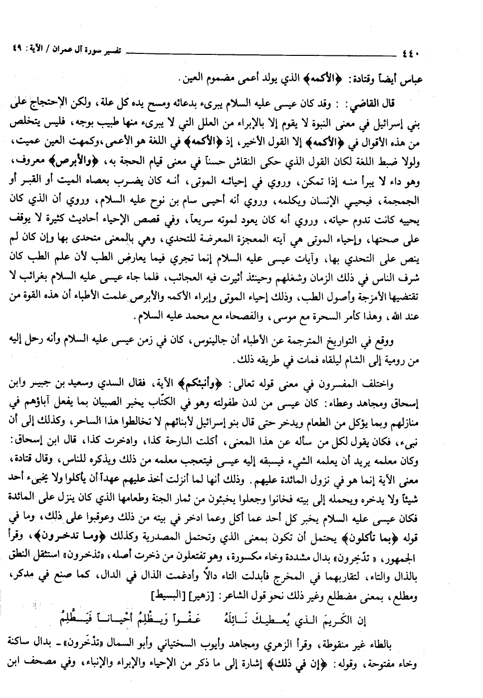 قال القاضي: وقد كان عيسى عليه السلام يبرىء بدعائه ومسح يده كل علة، ولكن الاحتجاج على بني إسرائيل في معنى النبوة لا يقوم إلا بالإبراء من العلل التي لا يبرىء منها طبيب بوجه، فليس يتخلص من هذه الأقوال في الْأَكْمَهَ إلا القول الأخير، إذ الْأَكْمَهَ في اللغة هو الأعمى، وكمهت العين عميت، ولولا ضبط اللغة لكان القول الذي حكى النقاش حسنا في معنى قيام الحجة به، وَالْأَبْرَصَ معروف، وهو داء لا يبرأ منه إذا تمكن، وروي في إحيائه الموتى، أنه كان يضرب بعصاه الميت أو القبر أو الجمجمة، فيحيي الإنسان ويكلمه، وروي أنه أحيى سام بن نوح عليه السلام، وروي أن الذي كان يحييه كانت تدوم حياته، وروي أنه كان يعود لموته سريعا، وفي قصص الإحياء أحاديث كثيرة لا يوقف على صحتها، وإحياء الموتى هي آيته المعجزة المعرضة للتحدي، وهي بالمعنى متحدى بها وإن كان لم ينص على التحدي بها، وآيات عيسى عليه السلام إنما تجري فيما يعارض الطب لأن علم الطب كان شرف الناس في ذلك الزمان وشغلهم وحينئذ أثيرت فيه العجائب، فلما جاء عيسى عليه السلام بغرائب لا تقتضيها الأمزجة وأصول الطب، وذلك إحياء الموتى وإبراء الأكمه والأبرص علمت الأطباء أن هذه القوة من عند الله، وهذا كأمر السحرة مع موسى، والفصحاء مع محمد عليه السلام.
