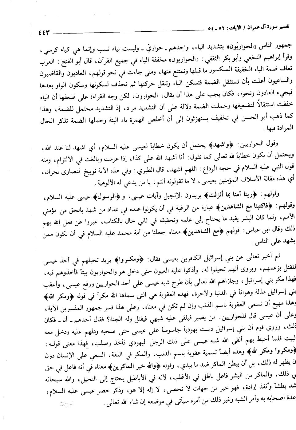 وقول الحواريين: وَاشْهَدْ يحتمل أن يكون خطابا لعيسى عليه السلام، أي اشهد لنا عند الله، ويحتمل أن يكون خطابا لله تعالى كما تقول: أنا أشهد الله على كذا، إذا عزمت وبالغت في الالتزام، ومنه قول النبي عليه السلام في حجة الوداع: اللهم اشهد، قال الطبري: وفي هذه الآية توبيخ لنصارى نجران، أي هذه مقالة الأسلاف المؤمنين بعيسى، لا ما تقولونه أنتم، يا من يدعي له الألوهية.