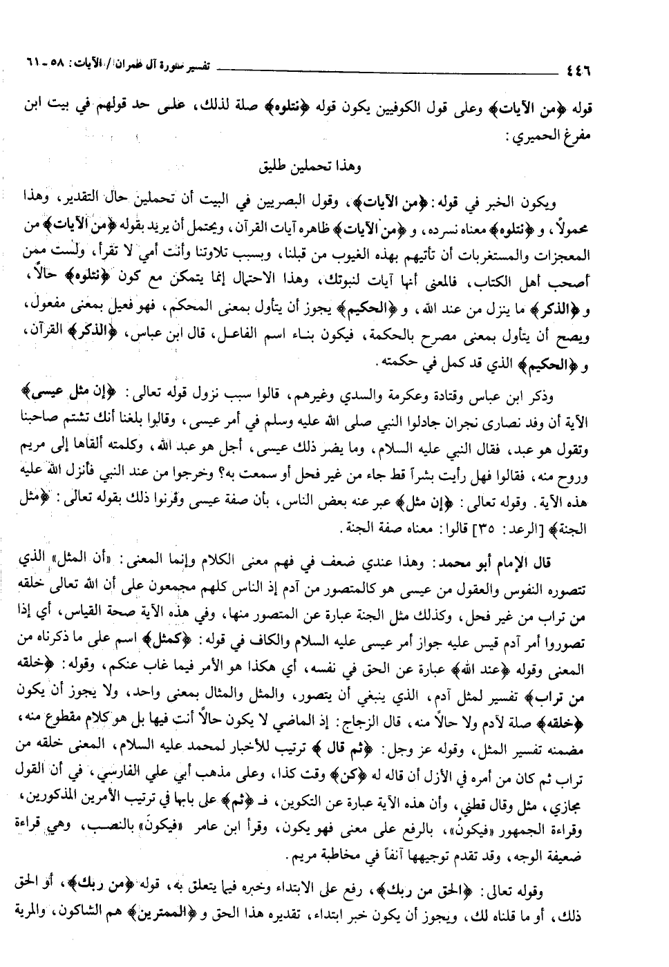 قال الإمام أبو محمد: وهذا عندي ضعف في فهم معنى الكلام وإنما المعنى: «أن المثل» الذي تتصوره النفوس والعقول من عيسى هو كالمتصور من آدم إذ الناس كلهم مجمعون على أن الله تعالى خلقه من تراب من غير فحل، وكذلك مثل الجنة عبارة عن المتصور منها، وفي هذه الآية صحة القياس، أي إذا تصوروا أمر آدم قيس عليه جواز أمر عيسى عليه السلام والكاف في قوله: كَمَثَلِ اسم على ما ذكرناه من المعنى وقوله عِنْدَ اللَّهِ عبارة عن الحق في نفسه، أي هكذا هو الأمر فيما غاب عنكم، وقوله: خَلَقَهُ مِنْ تُرابٍ تفسير لمثل آدم، الذي ينبغي أن يتصور، والمثل والمثال بمعنى واحد، ولا يجوز أن يكون خَلَقَهُ صلة لآدم ولا حالا منه، قال الزجاج: إذ الماضي لا يكون حالا أنت فيها بل هو كلام مقطوع منه، مضمنه تفسير المثل، وقوله عز وجل: ثُمَّ قالَ ترتيب للأخبار لمحمد عليه السلام، المعنى خلقه من تراب ثم كان من أمره في الأزل أن قاله له كُنْ وقت كذا، وعلى مذهب أبي علي الفارسي، في أن القول مجازي، مثل وقال قطني، وأن هذه الآية عبارة عن التكوين، ف ثُمَّ على بابها في ترتيب الأمرين المذكورين، وقراءة الجمهور «فيكون» ، بالرفع على معنى فهو يكون، وقرأ ابن عامر «فيكون» بالنصب، وهي قراءة ضعيفة الوجه، وقد تقدم توجيهها آنفا في مخاطبة مريم.