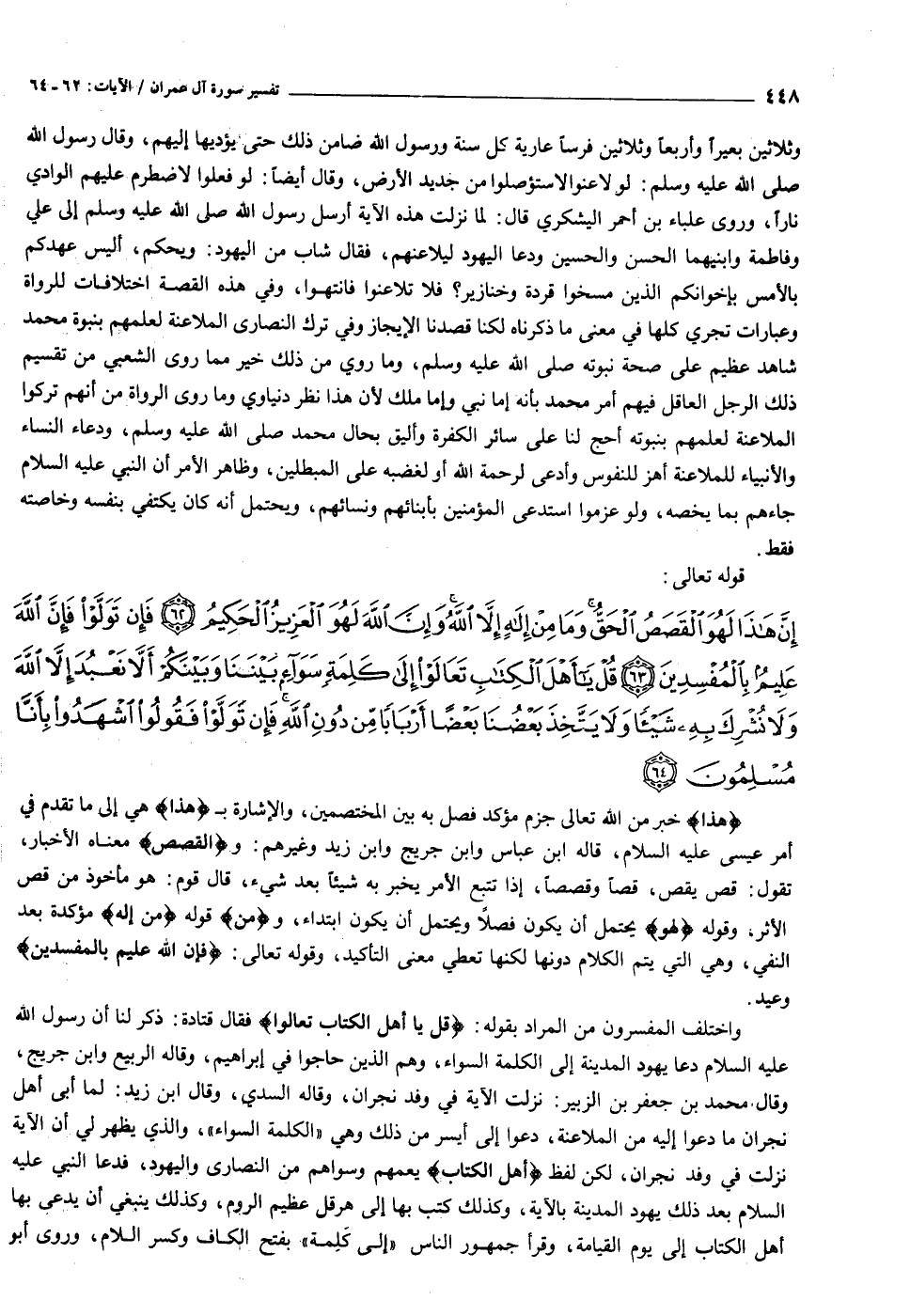 إِنَّ هذا لَهُوَ الْقَصَصُ الْحَقُّ وَما مِنْ إِلهٍ إِلاَّ اللَّهُ وَإِنَّ اللَّهَ لَهُوَ الْعَزِيزُ الْحَكِيمُ (٦٢) فَإِنْ تَوَلَّوْا فَإِنَّ اللَّهَ عَلِيمٌ بِالْمُفْسِدِينَ (٦٣) قُلْ يا أَهْلَ الْكِتابِ تَعالَوْا إِلى كَلِمَةٍ سَواءٍ بَيْنَنا وَبَيْنَكُمْ أَلاَّ نَعْبُدَ إِلاَّ اللَّهَ وَلا نُشْرِكَ بِهِ شَيْئاً وَلا يَتَّخِذَ بَعْضُنا بَعْضاً أَرْباباً مِنْ دُونِ اللَّهِ فَإِنْ تَوَلَّوْا فَقُولُوا اشْهَدُوا بِأَنَّا مُسْلِمُونَ (٦٤)