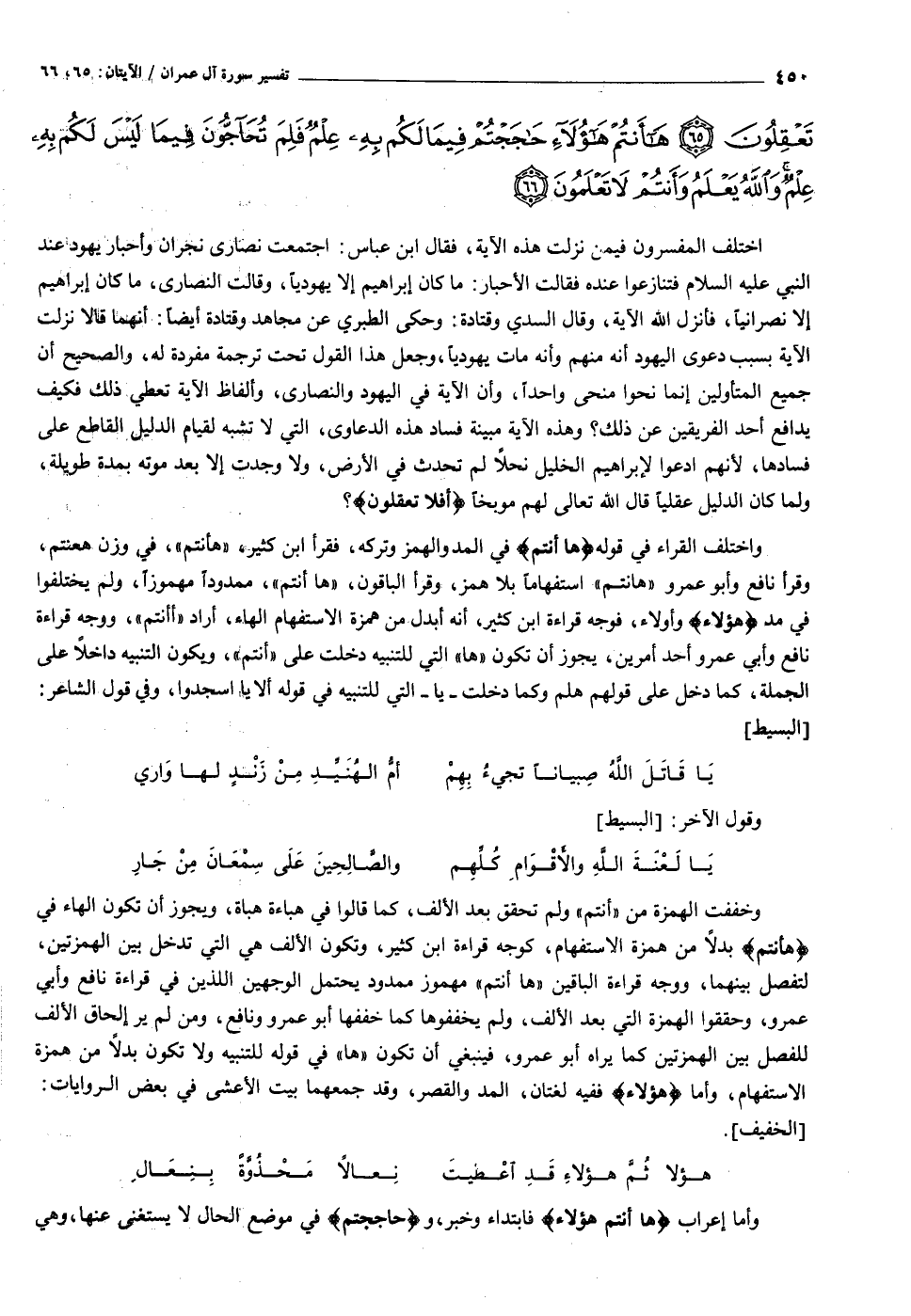 يا أَهْلَ الْكِتابِ لِمَ تُحَاجُّونَ فِي إِبْراهِيمَ وَما أُنْزِلَتِ التَّوْراةُ وَالْإِنْجِيلُ إِلاَّ مِنْ بَعْدِهِ أَفَلا تَعْقِلُونَ (٦٥) ها أَنْتُمْ هؤُلاءِ حاجَجْتُمْ فِيما لَكُمْ بِهِ عِلْمٌ فَلِمَ تُحَاجُّونَ فِيما لَيْسَ لَكُمْ بِهِ عِلْمٌ وَاللَّهُ يَعْلَمُ وَأَنْتُمْ لا تَعْلَمُونَ (٦٦)