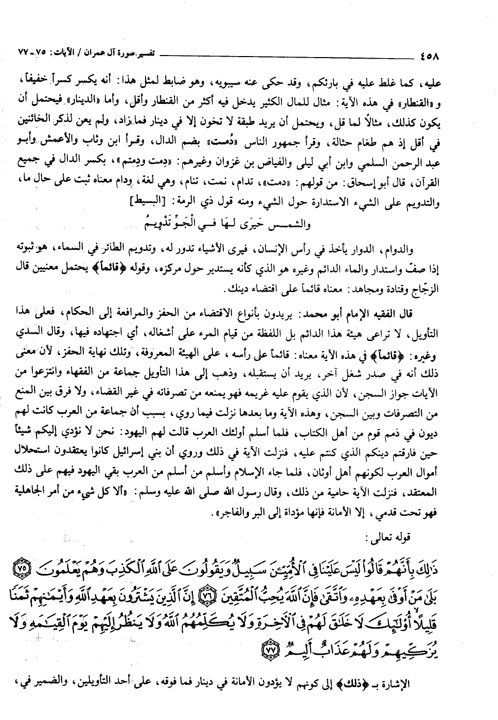 قال الفقيه الإمام أبو محمد: يريدون بأنواع الاقتضاء من الحفز والمرافعة إلى الحكام، فعلى هذا التأويل، لا تراعى هيئة هذا الدائم بل اللفظة من قيام المرء على أشغاله، أي اجتهاده فيها، وقال السدي وغيره: قائِماً في هذه الآية معناه: قائما على رأسه، على الهيئة المعروفة، وتلك نهاية الحفز، لأن معنى ذلك أنه في صدر شغل آخر، يريد أن يستقبله، وذهب إلى هذا التأويل جماعة من الفقهاء وانتزعوا من الآيات جواز السجن، لأن الذي يقوم عليه غريمه فهو يمنعه من تصرفاته في غير القضاء، ولا فرق بين المنع من التصرفات وبين السجن، وهذه الآية وما بعدها نزلت فيما روي، بسبب أن جماعة من العرب كانت لهم ديون في ذمم قوم من أهل الكتاب، فلما أسلم أولئك العرب قالت لهم اليهود: نحن لا نؤدي إليكم شيئا حين فارقتم دينكم الذي كنتم عليه، فنزلت الآية في ذلك وروي أن بني إسرائيل كانوا يعتقدون استحلال أموال العرب لكونهم أهل أوثان، فلما جاء الإسلام وأسلم من أسلم من العرب بقي اليهود فيهم على ذلك المعتقد، فنزلت الآية حامية من ذلك، وقال رسول الله صلى الله عليه وسلم: «ألا كل شيء من أمر الجاهلية فهو تحت قدمي، إلا الأمانة فإنها مؤداة إلى البر والفاجر» .