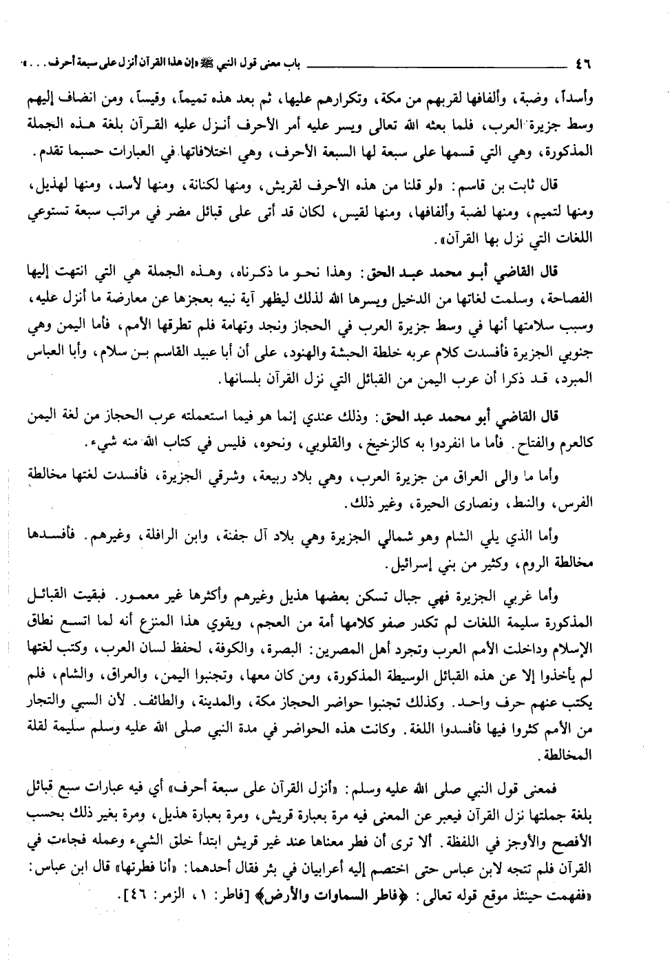 فمعنى قول النبي صلى الله عليه وسلم: «أنزل القرآن على سبعة أحرف» أي فيه عبارات سبع قبائل بلغة جملتها نزل القرآن فيعبر عن المعنى فيه مرة بعبارة قريش، ومرة بعبارة هذيل، ومرة بغير ذلك بحسب الأفصح والأوجز في اللفظة. ألا ترى أن فطر معناها عند غير قريش ابتدأ خلق الشيء وعمله فجاءت في القرآن فلم تتجه لابن عباس حتى اختصم إليه أعرابيان في بئر فقال أحدهما: «أنا فطرتها» قال ابن عباس: