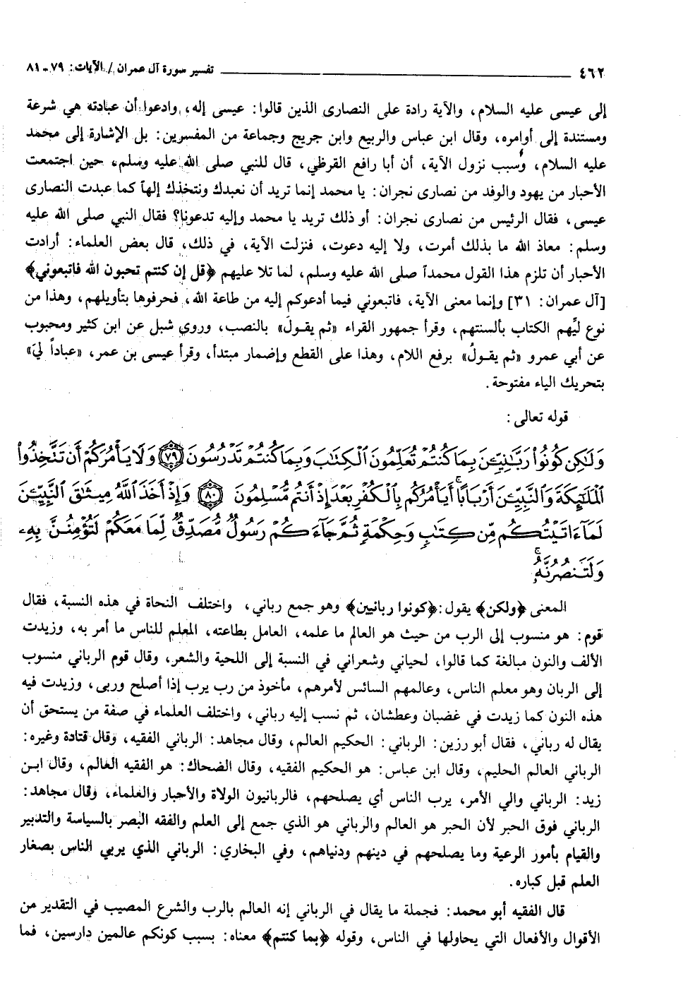 المعنى وَلكِنْ يقول: كُونُوا رَبَّانِيِّينَ وهو جمع رباني، واختلف النحاة في هذه النسبة، فقال قوم: هو منسوب إلى الرب من حيث هو العالم ما علمه، العامل بطاعته، المعلم للناس ما أمر به، وزيدت الألف والنون مبالغة كما قالوا، لحياني وشعراني في النسبة إلى اللحية والشعر، وقال قوم الرباني منسوب إلى الربان وهو معلم الناس، وعالمهم السائس لأمرهم، مأخوذ من رب يرب إذا أصلح وربى، وزيدت فيه هذه النون كما زيدت في غضبان وعطشان، ثم نسب إليه رباني، واختلف العلماء في صفة من يستحق أن يقال له رباني، فقال أبو رزين: الرباني: الحكيم العالم، وقال مجاهد: الرباني الفقيه، وقال قتادة وغيره: