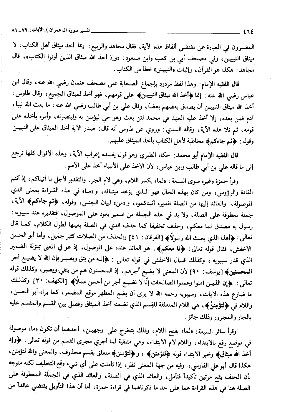 المفسرون في العبارة عن مقتضى ألفاظ هذه الآية، فقال مجاهد والربيع: إنما أخذ ميثاق أهل الكتاب، لا ميثاق النبيين، وفي مصحف أبي بن كعب وابن مسعود: «وإذ أخذ الله ميثاق الذين أوتوا الكتاب» ، قال مجاهد: هكذا هو القرآن، وإثبات «النبيين» خطأ من الكتاب.