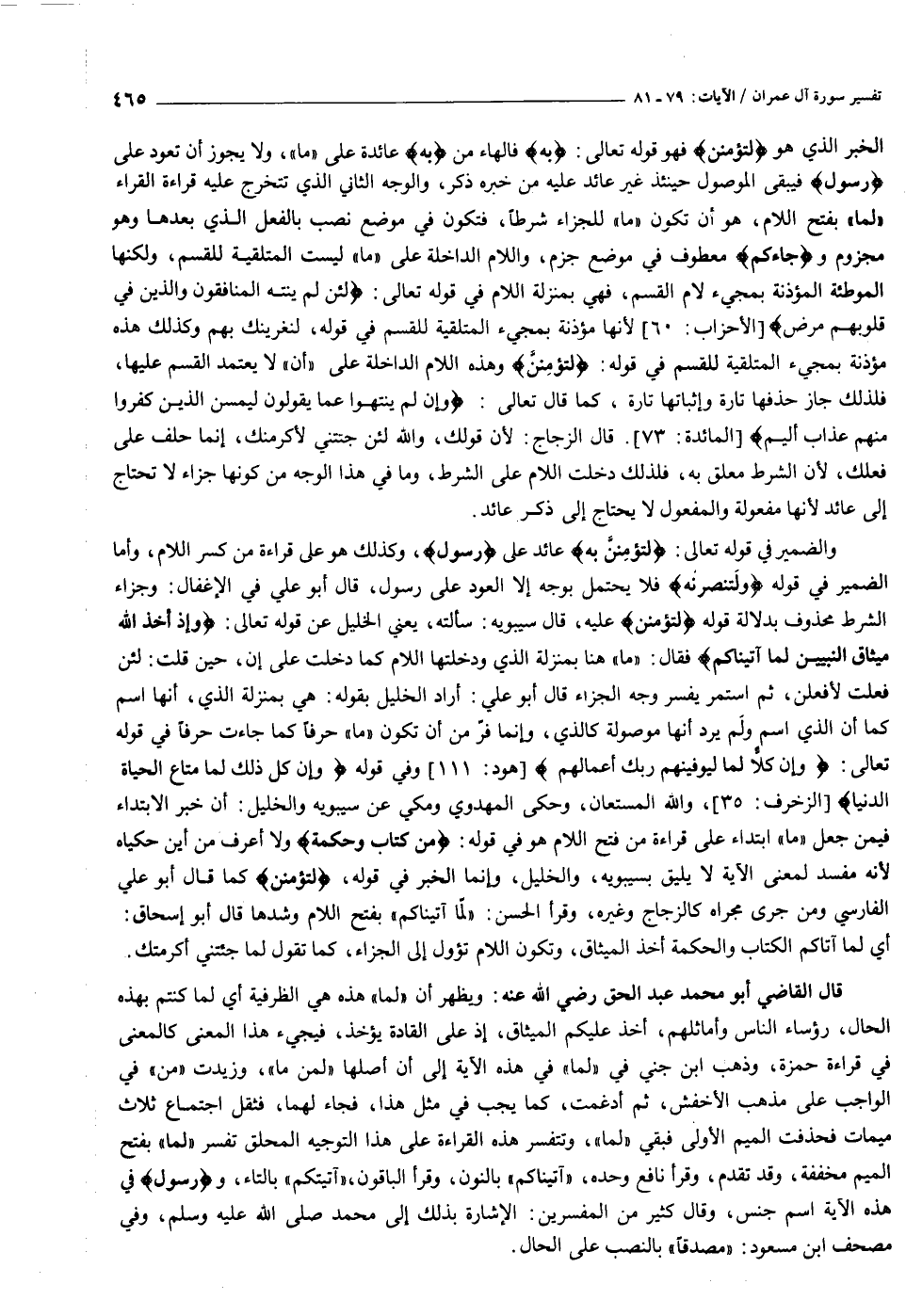 الخبر الذي هو لَتُؤْمِنُنَّ فهو قوله تعالى: بِهِ فالهاء من بِهِ عائدة على «ما» ولا يجوز أن تعود على رَسُولٌ فيبقى الموصول حينئذ غير عائد عليه من خبره ذكر، والوجه الثاني الذي تتخرج عليه قراءة القراء «لما» بفتح اللام، هو أن تكون «ما» للجزاء شرطا، فتكون في موضع نصب بالفعل الذي بعدها وهو مجزوم وجاءَكُمْ معطوف في موضع جزم، واللام الداخلة على «ما» ليست المتلقية للقسم، ولكنها الموطئة المؤذنة بمجيء لام القسم، فهي بمنزلة اللام في قوله تعالى: لَئِنْ لَمْ يَنْتَهِ الْمُنافِقُونَ وَالَّذِينَ فِي قُلُوبِهِمْ مَرَضٌ [الأحزاب: ٦٠] لأنها مؤذنة بمجيء المتلقية للقسم في قوله، لنغرينك بهم وكذلك هذه مؤذنة بمجيء المتلقية للقسم في قوله: لَتُؤْمِنُنَّ وهذه اللام الداخلة على «أن» لا يعتمد القسم عليها، فلذلك جاز حذفها تارة وإثباتها تارة، كما قال تعالى: وَإِنْ لَمْ يَنْتَهُوا عَمَّا يَقُولُونَ لَيَمَسَّنَّ الَّذِينَ كَفَرُوا مِنْهُمْ عَذابٌ أَلِيمٌ [المائدة: ٧٣] . قال الزجاج: لأن قولك، والله لئن جنتني لأكرمنك، إنما حلف على فعلك، لأن الشرط معلق به، فلذلك دخلت اللام على الشرط، وما في هذا الوجه من كونها جزاء لا تحتاج إلى عائد لأنها مفعولة والمفعول لا يحتاج إلى ذكر عائد.