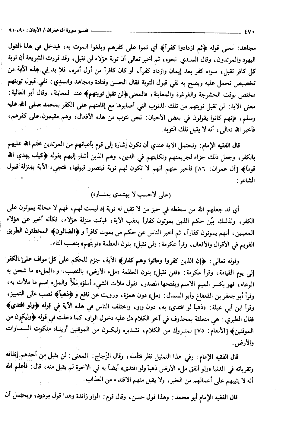 قال الفقيه الإمام: وفي هذا التمثيل نظر فتأمله، وقال الزجّاج: المعنى: لن يقبل من أحدهم إنفاقه وتقرباته في الدنيا «ولو أنفق ملء الأرض ذهبا ولو افتدى» أيضا به في الآخرة لم يقبل منه، قال: فأعلم الله أنه لا يثيبهم على أعمالهم من الخير، ولا يقبل منهم الافتداء من العذاب.