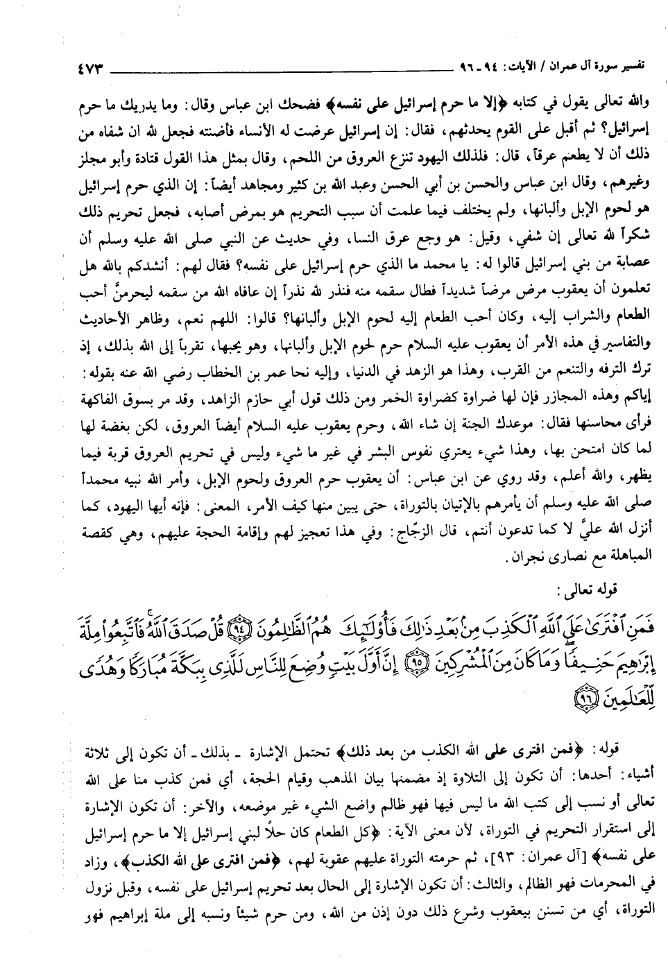فَمَنِ افْتَرى عَلَى اللَّهِ الْكَذِبَ مِنْ بَعْدِ ذلِكَ فَأُولئِكَ هُمُ الظَّالِمُونَ (٩٤) قُلْ صَدَقَ اللَّهُ فَاتَّبِعُوا مِلَّةَ إِبْراهِيمَ حَنِيفاً وَما كانَ مِنَ الْمُشْرِكِينَ (٩٥) إِنَّ أَوَّلَ بَيْتٍ وُضِعَ لِلنَّاسِ لَلَّذِي بِبَكَّةَ مُبارَكاً وَهُدىً لِلْعالَمِينَ (٩٦)