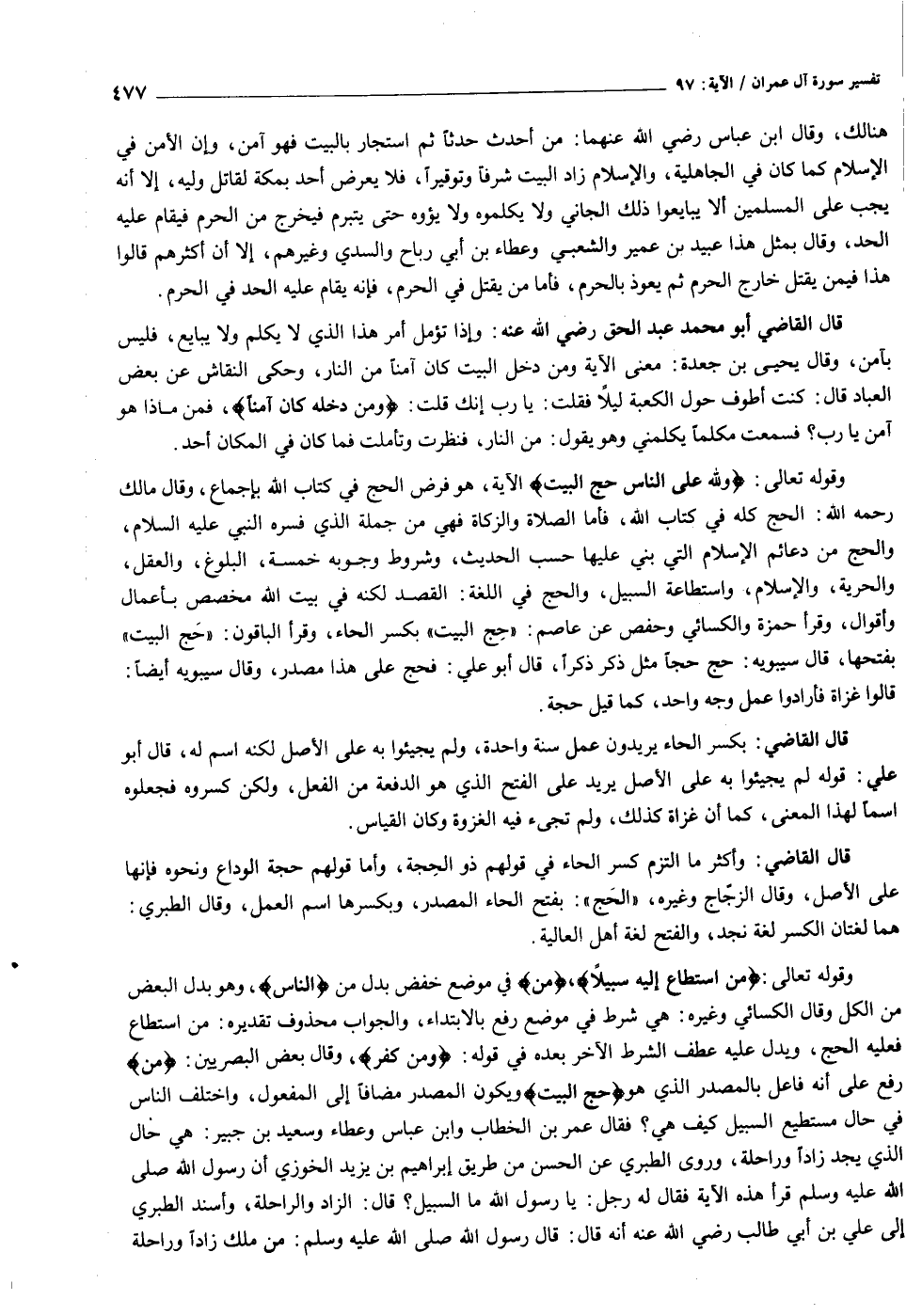 وقوله تعالى: مَنِ اسْتَطاعَ إِلَيْهِ سَبِيلًا، مَنْ في موضع خفض بدل من النَّاسِ، وهو بدل البعض من الكل وقال الكسائي وغيره: هي شرط في موضع رفع بالابتداء، والجواب محذوف تقديره: من استطاع فعليه الحج، ويدل عليه عطف الشرط الآخر بعده في قوله: وَمَنْ كَفَرَ، وقال بعض البصريين: مَنْ رفع على أنه فاعل بالمصدر الذي هو حِجُّ الْبَيْتِ ويكون المصدر مضافا إلى المفعول، واختلف الناس في حال مستطيع السبيل كيف هي؟ فقال عمر بن الخطاب وابن عباس وعطاء وسعيد بن جبير: هي حال الذي يجد زادا وراحلة، وروى الطبري عن الحسن من طريق إبراهيم بن يزيد الخوزي أن رسول الله صلى الله عليه وسلم قرأ هذه الآية فقال له رجل: يا رسول الله ما السبيل؟ قال: الزاد والراحلة، وأسند الطبري إلى علي بن أبي طالب رضي الله عنه أنه قال: قال رسول الله صلى الله عليه وسلم: من ملك زادا وراحلة
