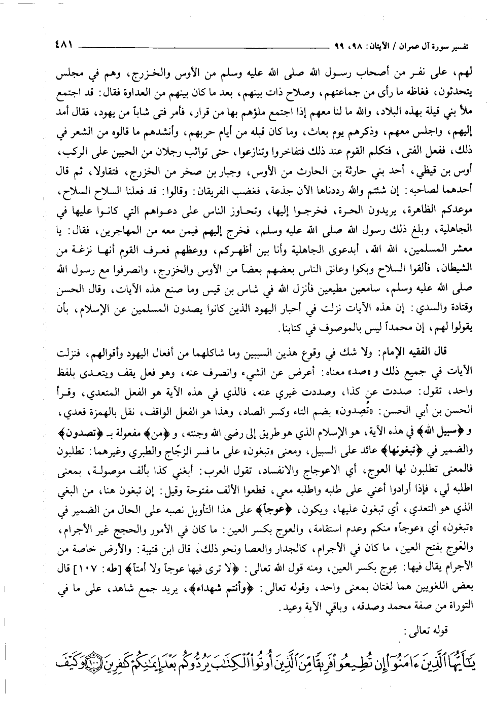لهم، على نفر من أصحاب رسول الله صلى الله عليه وسلم من الأوس والخزرج، وهم في مجلس يتحدثون، فغاظه ما رأى من جماعتهم، وصلاح ذات بينهم، بعد ما كان بينهم من العداوة فقال: قد اجتمع ملأ بني قيلة بهذه البلاد، والله ما لنا معهم إذا اجتمع ملؤهم بها من قرار، فأمر فتى شابا من يهود، فقال أمد إليهم، واجلس معهم، وذكرهم يوم بعاث، وما كان قبله من أيام حربهم، وأنشدهم ما قالوه من الشعر في ذلك، ففعل الفتى، فتكلم القوم عند ذلك فتفاخروا وتنازعوا، حتى تواثب رجلان من الحيين على الركب، أوس بن قيظي، أحد بني حارثة بن الحارث من الأوس، وجبار بن صخر من الخزرج، فتقاولا، ثم قال أحدهما لصاحبه: إن شئتم والله رددناها الآن جذعة، فغضب الفريقان: وقالوا: قد فعلنا السلاح السلاح، موعدكم الظاهرة، يريدون الحرة، فخرجوا إليها، وتحاوز الناس على دعواهم التي كانوا عليها في الجاهلية، وبلغ ذلك رسول الله صلى الله عليه وسلم، فخرج إليهم فيمن معه من المهاجرين، فقال: يا معشر المسلمين، الله الله، أبدعوى الجاهلية وأنا بين أظهركم، ووعظهم فعرف القوم أنها نزغة من الشيطان، فألقوا السلاح وبكوا وعانق الناس بعضهم بعضا من الأوس والخزرج، وانصرفوا مع رسول الله صلى الله عليه وسلم، سامعين مطيعين فأنزل الله في شاس بن قيس وما صنع هذه الآيات، وقال الحسن وقتادة والسدي: إن هذه الآيات نزلت في أحبار اليهود الذين كانوا يصدون المسلمين عن الإسلام، بأن يقولوا لهم، إن محمدا ليس بالموصوف في كتابنا.