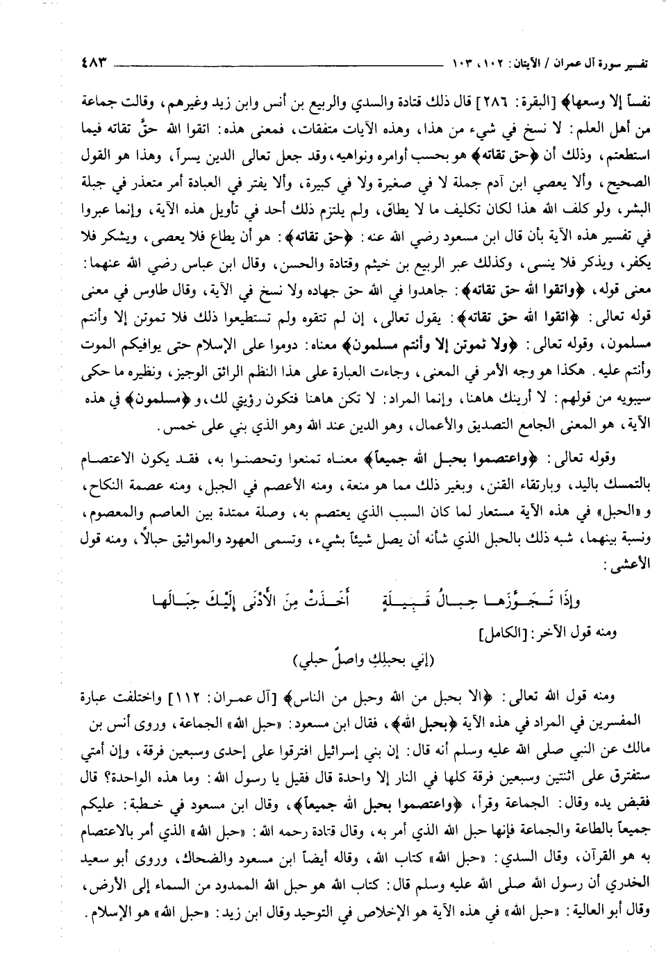 ومنه قول الآخر: [الكامل] (إني بحبلك واصل حبلي) ومنه قول الله تعالى: إِلَّا بِحَبْلٍ مِنَ اللَّهِ وَحَبْلٍ مِنَ النَّاسِ [آل عمران: ١١٢] واختلفت عبارة المفسرين في المراد في هذه الآية بِحَبْلِ اللَّهِ، فقال ابن مسعود: «حبل الله» الجماعة، وروى أنس بن مالك عن النبي صلى الله عليه وسلم أنه قال: إن بني إسرائيل افترقوا على إحدى وسبعين فرقة، وإن أمتي ستفترق على اثنتين وسبعين فرقة كلها في النار إلا واحدة قال فقيل يا رسول الله: وما هذه الواحدة؟ قال فقبض يده وقال: الجماعة وقرأ، وَاعْتَصِمُوا بِحَبْلِ اللَّهِ جَمِيعاً، وقال ابن مسعود في خطبة: عليكم جميعا بالطاعة والجماعة فإنها حبل الله الذي أمر به، وقال قتادة رحمه الله: «حبل الله» الذي أمر بالاعتصام به هو القرآن، وقال السدي: «حبل الله» كتاب الله، وقاله أيضا ابن مسعود والضحاك، وروى أبو سعيد الخدري أن رسول الله صلى الله عليه وسلم قال: كتاب الله هو حبل الله الممدود من السماء إلى الأرض، وقال أبو العالية: «حبل الله» في هذه الآية هو الإخلاص في التوحيد وقال ابن زيد: «حبل الله» هو الإسلام.
