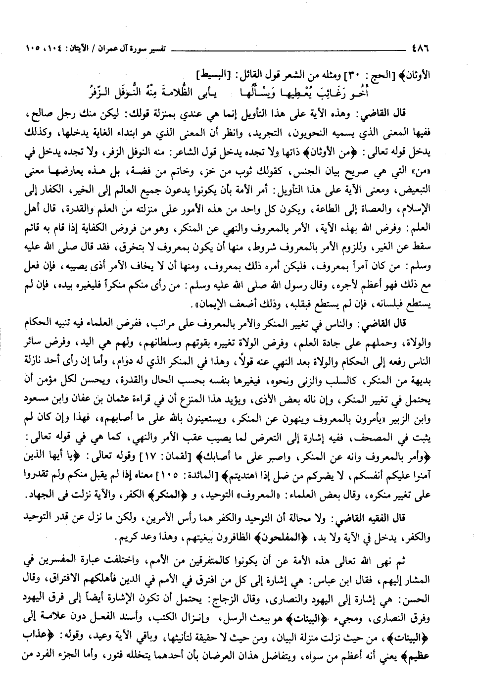 قال القاضي: وهذه الآية على هذا التأويل إنما هي عندي بمنزلة قولك: ليكن منك رجل صالح، ففيها المعنى الذي يسميه النحويون، التجريد، وانظر أن المعنى الذي هو ابتداء الغاية يدخلها، وكذلك يدخل قوله تعالى: مِنَ الْأَوْثانِ ذاتها ولا تجده يدخل قول الشاعر: منه النوفل الزفر، ولا تجده يدخل في «من» التي هي صريح بيان الجنس، كقولك ثوب من خز، وخاتم من فضة، بل هذه يعارضها معنى التبعيض، ومعنى الآية على هذا التأويل: أمر الأمة بأن يكونوا يدعون جميع العالم إلى الخير، الكفار إلى الإسلام، والعصاة إلى الطاعة، ويكون كل واحد من هذه الأمور على منزلته من العلم والقدرة، قال أهل العلم: وفرض الله بهذه الآية، الأمر بالمعروف والنهي عن المنكر، وهو من فروض الكفاية إذا قام به قائم سقط عن الغير، وللزوم الأمر بالمعروف شروط، منها أن يكون بمعروف لا بتخرق، فقد قال صلى الله عليه وسلم: من كان آمرا بمعروف، فليكن أمره ذلك بمعروف، ومنها أن لا يخاف الآمر أذى يصيبه، فإن فعل مع ذلك فهو أعظم لأجره، وقال رسول الله صلى الله عليه وسلم: من رأى منكم منكرا فليغيره بيده، فإن لم يستطع فبلسانه، فإن لم يستطع فبقلبه، وذلك أضعف الإيمان» .