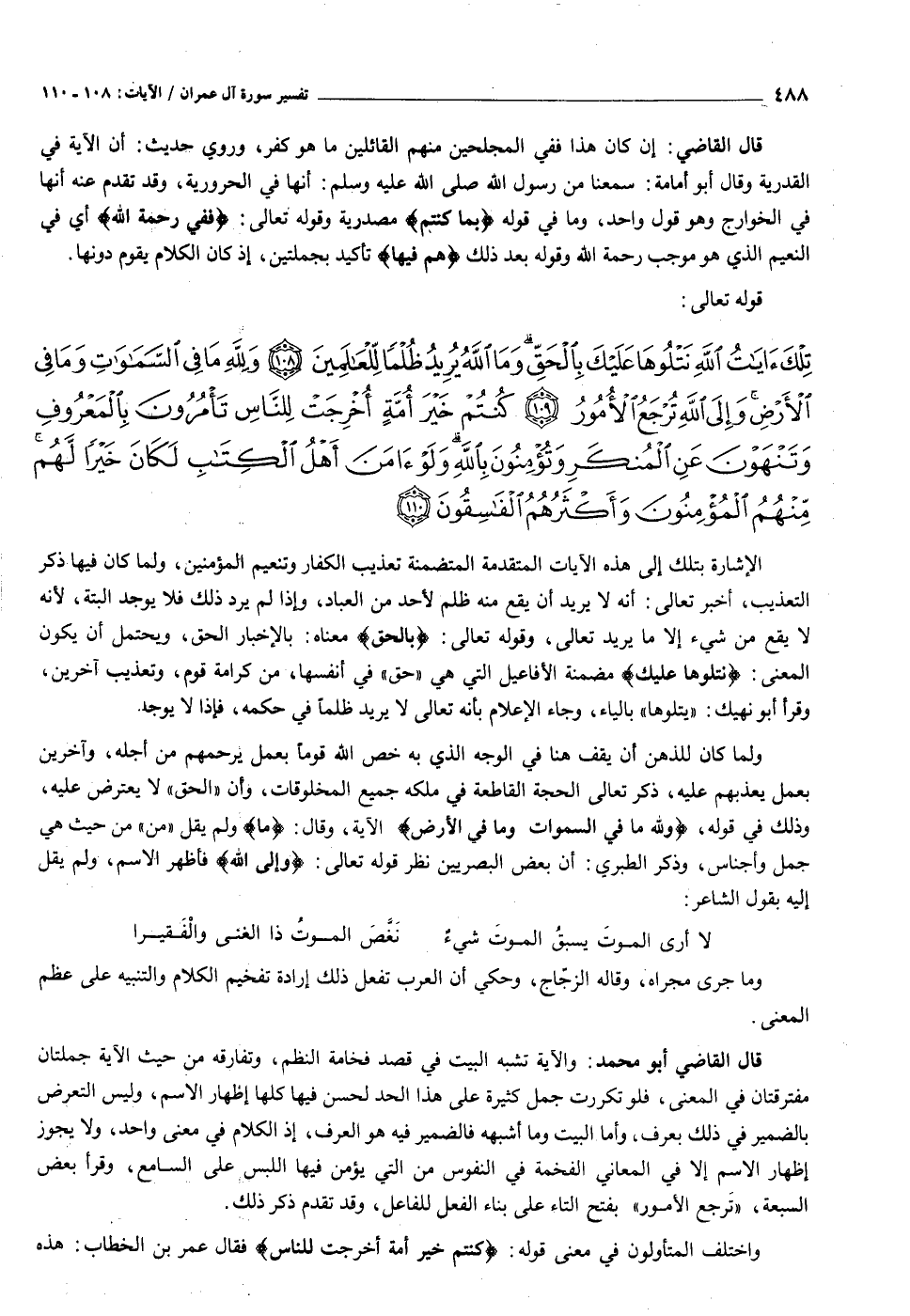 تِلْكَ آياتُ اللَّهِ نَتْلُوها عَلَيْكَ بِالْحَقِّ وَمَا اللَّهُ يُرِيدُ ظُلْماً لِلْعالَمِينَ (١٠٨) وَلِلَّهِ ما فِي السَّماواتِ وَما فِي الْأَرْضِ وَإِلَى اللَّهِ تُرْجَعُ الْأُمُورُ (١٠٩) كُنْتُمْ خَيْرَ أُمَّةٍ أُخْرِجَتْ لِلنَّاسِ تَأْمُرُونَ بِالْمَعْرُوفِ وَتَنْهَوْنَ عَنِ الْمُنْكَرِ وَتُؤْمِنُونَ بِاللَّهِ وَلَوْ آمَنَ أَهْلُ الْكِتابِ لَكانَ خَيْراً لَهُمْ مِنْهُمُ الْمُؤْمِنُونَ وَأَكْثَرُهُمُ الْفاسِقُونَ (١١٠)