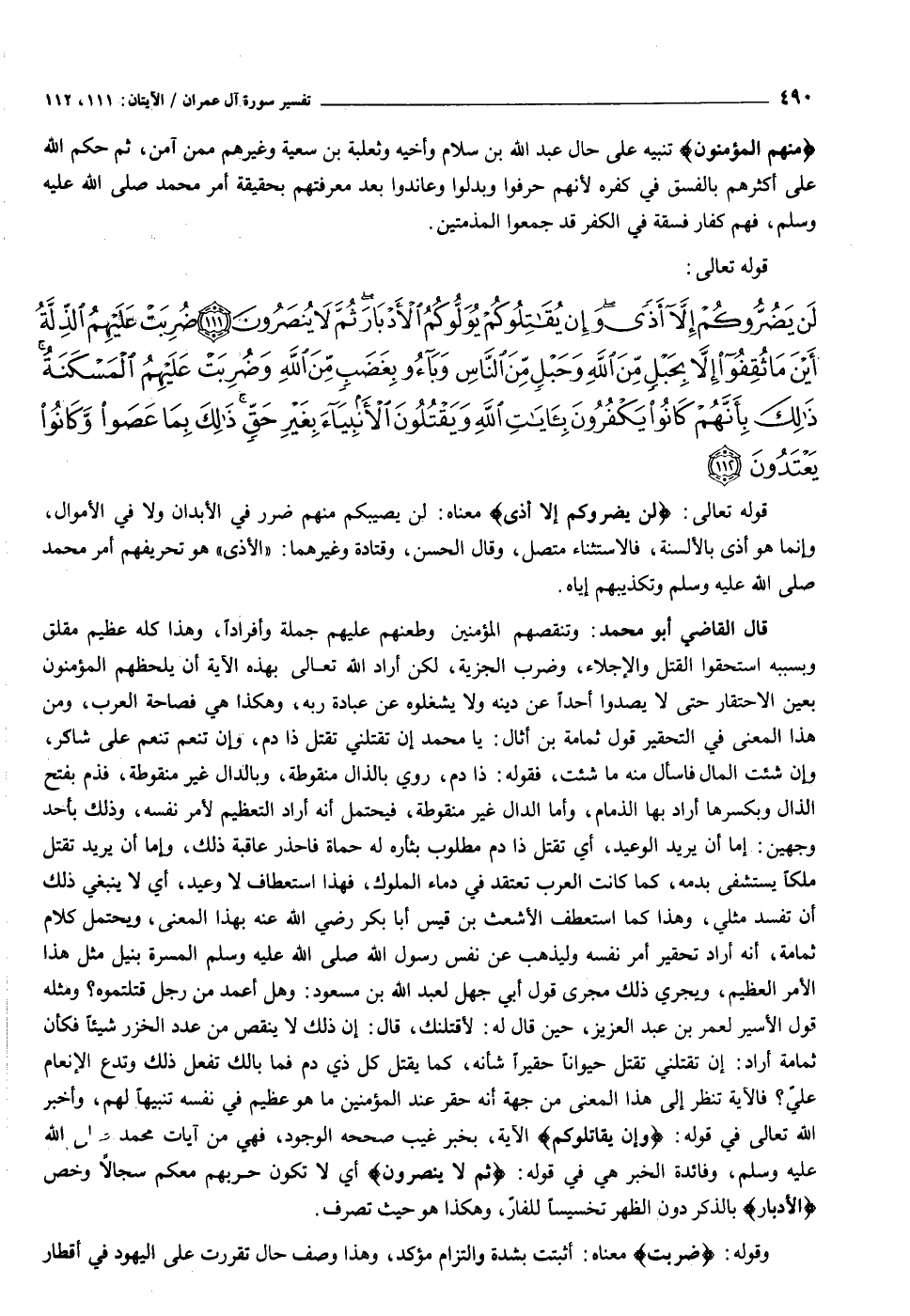لَنْ يَضُرُّوكُمْ إِلاَّ أَذىً وَإِنْ يُقاتِلُوكُمْ يُوَلُّوكُمُ الْأَدْبارَ ثُمَّ لا يُنْصَرُونَ (١١١) ضُرِبَتْ عَلَيْهِمُ الذِّلَّةُ أَيْنَ ما ثُقِفُوا إِلاَّ بِحَبْلٍ مِنَ اللَّهِ وَحَبْلٍ مِنَ النَّاسِ وَباؤُ بِغَضَبٍ مِنَ اللَّهِ وَضُرِبَتْ عَلَيْهِمُ الْمَسْكَنَةُ ذلِكَ بِأَنَّهُمْ كانُوا يَكْفُرُونَ بِآياتِ اللَّهِ وَيَقْتُلُونَ الْأَنْبِياءَ بِغَيْرِ حَقٍّ ذلِكَ بِما عَصَوْا وَكانُوا يَعْتَدُونَ (١١٢)