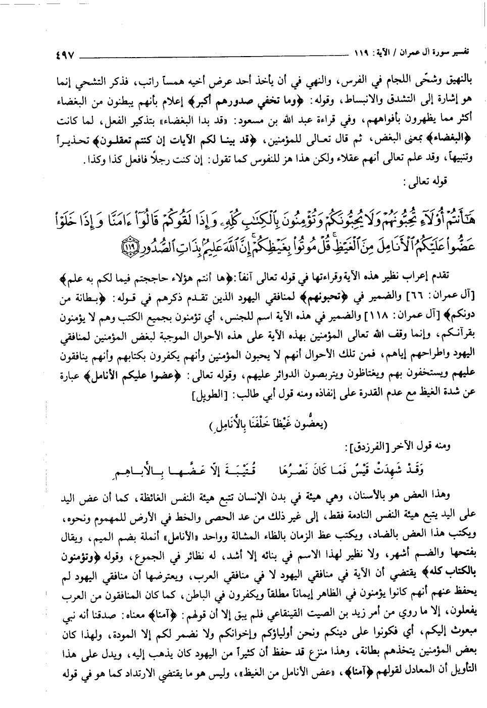 وهذا العض هو بالأسنان، وهي هيئة في بدن الإنسان تتبع هيئة النفس الغائظة، كما أن عض اليد على اليد يتبع هيئة النفس النادمة فقط، إلى غير ذلك من عد الحصى والخط في الأرض للمهموم ونحوه، ويكتب هذا العض بالضاد، ويكتب عظ الزمان بالظاء المشالة وواحد «الأنامل» أنملة بضم الميم، ويقال بفتحها والضم أشهر، ولا نظير لهذا الاسم في بنائه إلا أشد، له نظائر في الجموع، وقوله وَتُؤْمِنُونَ بِالْكِتابِ كُلِّهِ يقتضي أن الآية في منافقي اليهود لا في منافقي العرب، ويعترضها أن منافقي اليهود لم يحفظ عنهم أنهم كانوا يؤمنون في الظاهر إيمانا مطلقا ويكفرون في الباطن، كما كان المنافقون من العرب يفعلون، إلا ما روي من أمر زيد بن الصيت القينقاعي فلم يبق إلا أن قولهم: آمَنَّا معناه: صدقنا أنه نبي مبعوث إليكم، أي فكونوا على دينكم ونحن أولياؤكم وإخوانكم ولا نضمر لكم إلا المودة، ولهذا كان بعض المؤمنين يتخذهم بطانة، وهذا منزع قد حفظ أن كثيرا من اليهود كان يذهب إليه، ويدل على هذا التأويل أن المعادل لقولهم آمَنَّا، «عض الأنامل من الغيظ» ، وليس هو ما يقتضي الارتداد كما هو في قوله