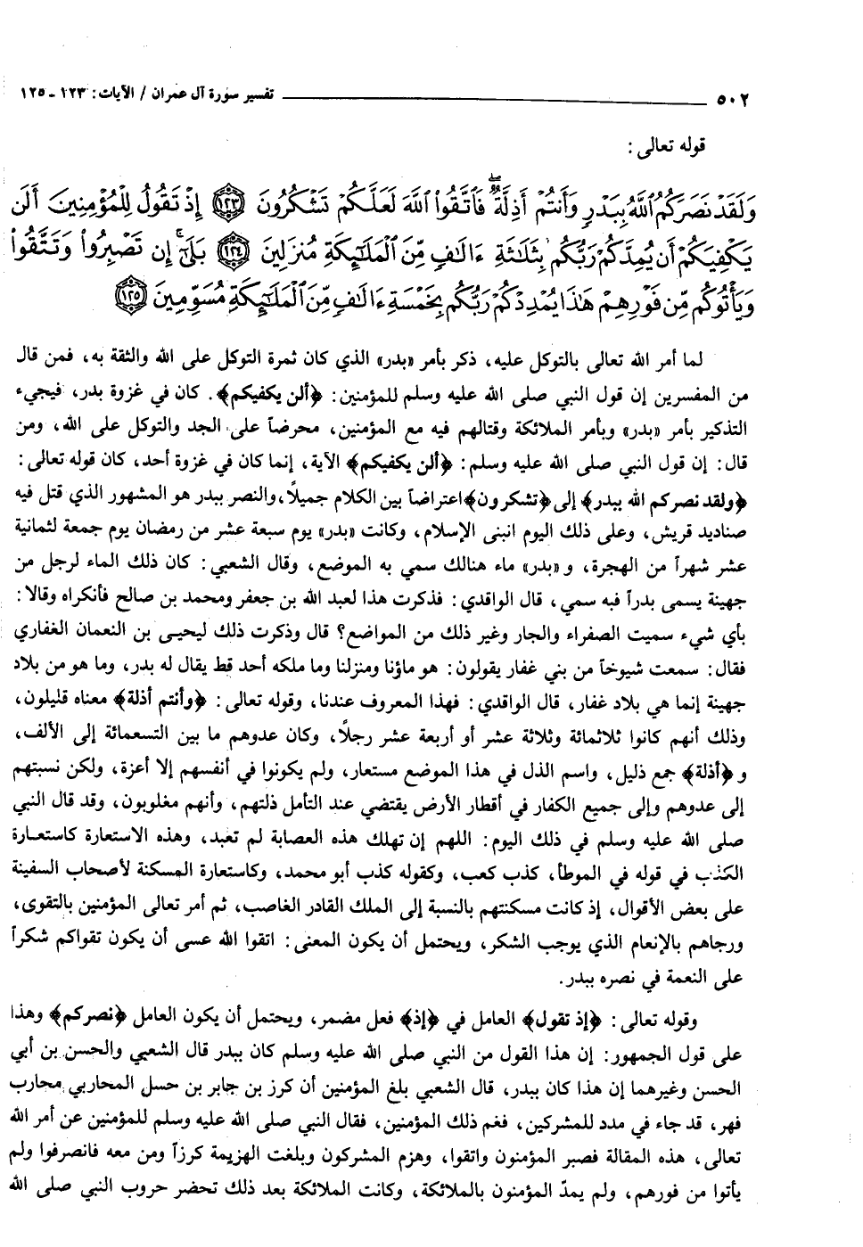 وَلَقَدْ نَصَرَكُمُ اللَّهُ بِبَدْرٍ وَأَنْتُمْ أَذِلَّةٌ فَاتَّقُوا اللَّهَ لَعَلَّكُمْ تَشْكُرُونَ (١٢٣) إِذْ تَقُولُ لِلْمُؤْمِنِينَ أَلَنْ يَكْفِيَكُمْ أَنْ يُمِدَّكُمْ رَبُّكُمْ بِثَلاثَةِ آلافٍ مِنَ الْمَلائِكَةِ مُنْزَلِينَ (١٢٤) بَلى إِنْ تَصْبِرُوا وَتَتَّقُوا وَيَأْتُوكُمْ مِنْ فَوْرِهِمْ هذا يُمْدِدْكُمْ رَبُّكُمْ بِخَمْسَةِ آلافٍ مِنَ الْمَلائِكَةِ مُسَوِّمِينَ (١٢٥)