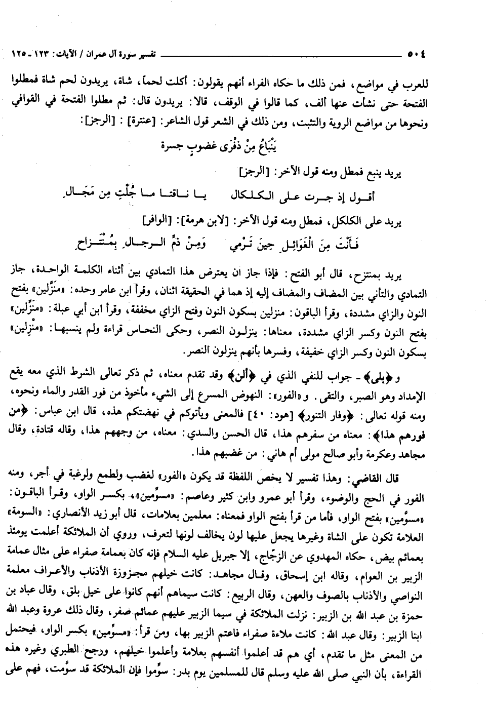 قال القاضي: وهذا تفسير لا يخص اللفظة قد يكون «الفور» لغضب ولطمع ولرغبة في أجر، ومنه الفور في الحج والوضوء، وقرأ أبو عمرو وابن كثير وعاصم: «مسوّمين» ، بكسر الواو، وقرأ الباقون: