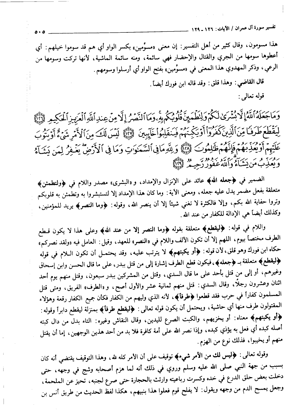 وَما جَعَلَهُ اللَّهُ إِلاَّ بُشْرى لَكُمْ وَلِتَطْمَئِنَّ قُلُوبُكُمْ بِهِ وَمَا النَّصْرُ إِلاَّ مِنْ عِنْدِ اللَّهِ الْعَزِيزِ الْحَكِيمِ (١٢٦) لِيَقْطَعَ طَرَفاً مِنَ الَّذِينَ كَفَرُوا أَوْ يَكْبِتَهُمْ فَيَنْقَلِبُوا خائِبِينَ (١٢٧) لَيْسَ لَكَ مِنَ الْأَمْرِ شَيْءٌ أَوْ يَتُوبَ عَلَيْهِمْ أَوْ يُعَذِّبَهُمْ فَإِنَّهُمْ ظالِمُونَ (١٢٨) وَلِلَّهِ ما فِي السَّماواتِ وَما فِي الْأَرْضِ يَغْفِرُ لِمَنْ يَشاءُ وَيُعَذِّبُ مَنْ يَشاءُ وَاللَّهُ غَفُورٌ رَحِيمٌ (١٢٩)