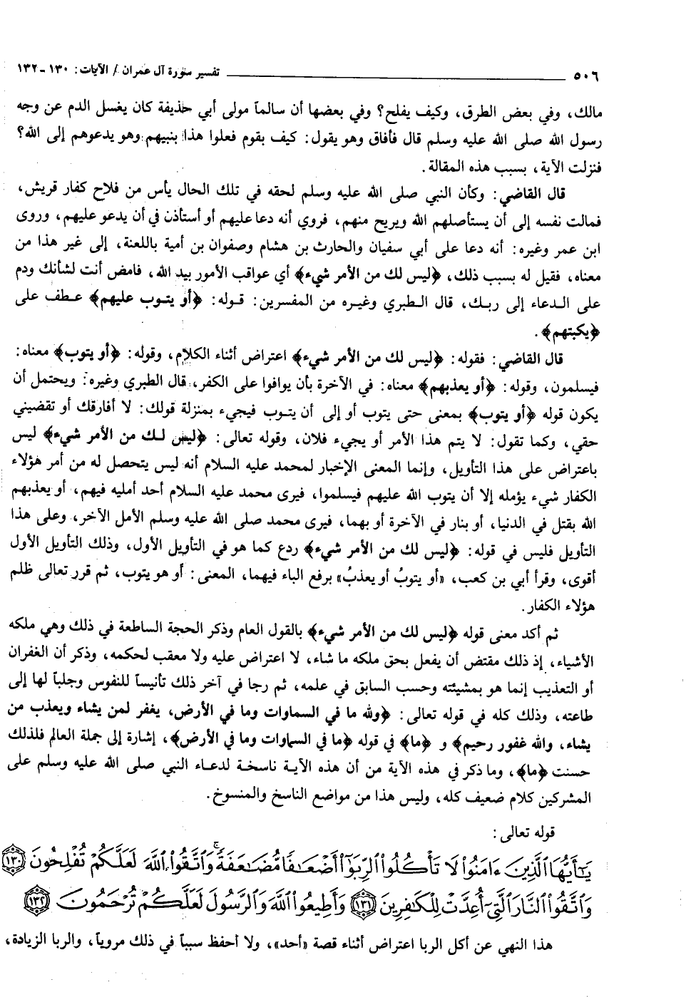 يا أَيُّهَا الَّذِينَ آمَنُوا لا تَأْكُلُوا الرِّبَوا أَضْعافاً مُضاعَفَةً وَاتَّقُوا اللَّهَ لَعَلَّكُمْ تُفْلِحُونَ (١٣٠) وَاتَّقُوا النَّارَ الَّتِي أُعِدَّتْ لِلْكافِرِينَ (١٣١) وَأَطِيعُوا اللَّهَ وَالرَّسُولَ لَعَلَّكُمْ تُرْحَمُونَ (١٣٢)
