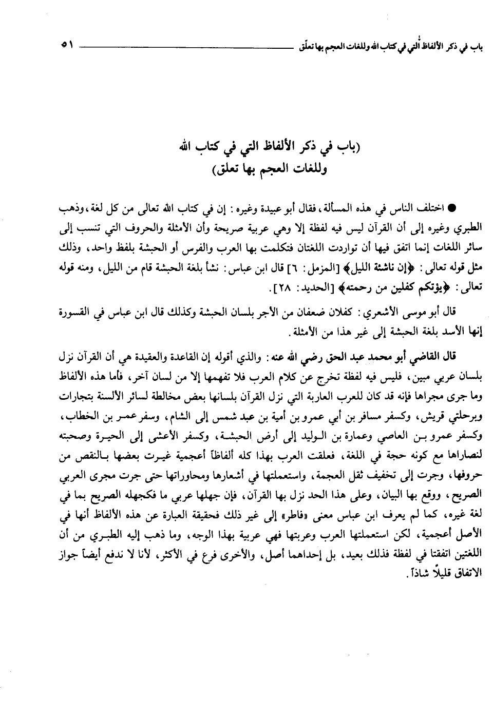 قال القاضي أبو محمد عبد الحق رضي الله عنه: والذي أقوله إن القاعدة والعقيدة هي أن القرآن نزل بلسان عربي مبين، فليس فيه لفظة تخرج عن كلام العرب فلا تفهمها إلا من لسان آخر، فأما هذه الألفاظ وما جرى مجراها فإنه قد كان للعرب العاربة التي نزل القرآن بلسانها بعض مخالطة لسائر الألسنة بتجارات وبرحلتي قريش، وكسفر مسافر بن أبي عمرو بن أمية بن عبد شمس إلى الشام، وسفر عمر بن الخطاب، وكسفر عمرو بن العاصي وعمارة بن الوليد إلى أرض الحبشة، وكسفر الأعشى إلى الحيرة وصحبته لنصاراها مع كونه حجة في اللغة، فعلقت العرب بهذا كله ألفاظا أعجمية غيرت بعضها بالنقص من حروفها، وجرت إلى تخفيف ثقل العجمة، واستعملتها في أشعارها ومحاوراتها حتى جرت مجرى العربي الصريح، ووقع بها البيان، وعلى هذا الحد نزل بها القرآن، فإن جهلها عربي ما فكجهله الصريح بما في لغة غيره، كما لم يعرف ابن عباس معنى «فاطر» إلى غير ذلك فحقيقة العبارة عن هذه الألفاظ أنها في الأصل أعجمية، لكن استعملتها العرب وعربتها فهي عربية بهذا الوجه، وما ذهب إليه الطبري من أن اللغتين اتفقتا في لفظة فذلك بعيد، بل إحداهما أصل، والأخرى فرع في الأكثر، لأنا لا ندفع أيضا جواز الاتفاق قليلا شاذا.