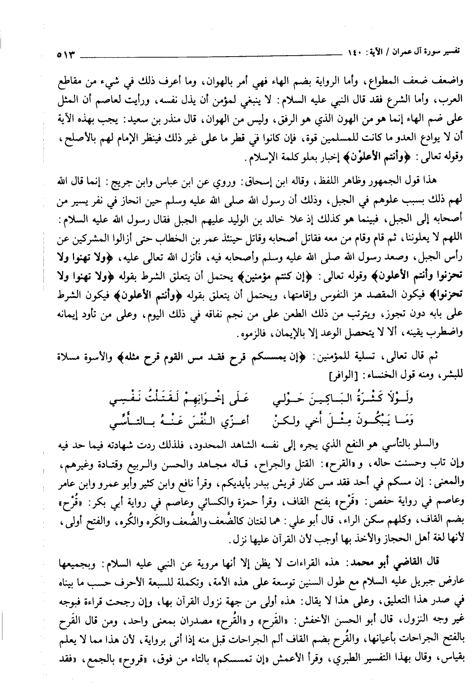 قال القاضي أبو محمد: هذه القراءات لا يظن إلا أنها مروية عن النبي عليه السلام: وبجميعها عارض جبريل عليه السلام مع طول السنين توسعة على هذه الأمة، وتكملة للسبعة الأحرف حسب ما بيناه في صدر هذا التعليق، وعلى هذا لا يقال: هذه أولى من جهة نزول القرآن بها، وإن رجحت قراءة فبوجه غير وجه النزول، قال أبو الحسن الأخفش: «القرح» و «القرح» مصدران بمعنى واحد، ومن قال القرح بالفتح الجراحات بأعيانها، والقرح بضم القاف ألم الجراحات قبل منه إذا أتى برواية، لأن هذا مما لا يعلم بقياس، وقال بهذا التفسير الطبري، وقرأ الأعمش «إن تمسسكم» بالتاء من فوق، «قروح» بالجمع، «فقد