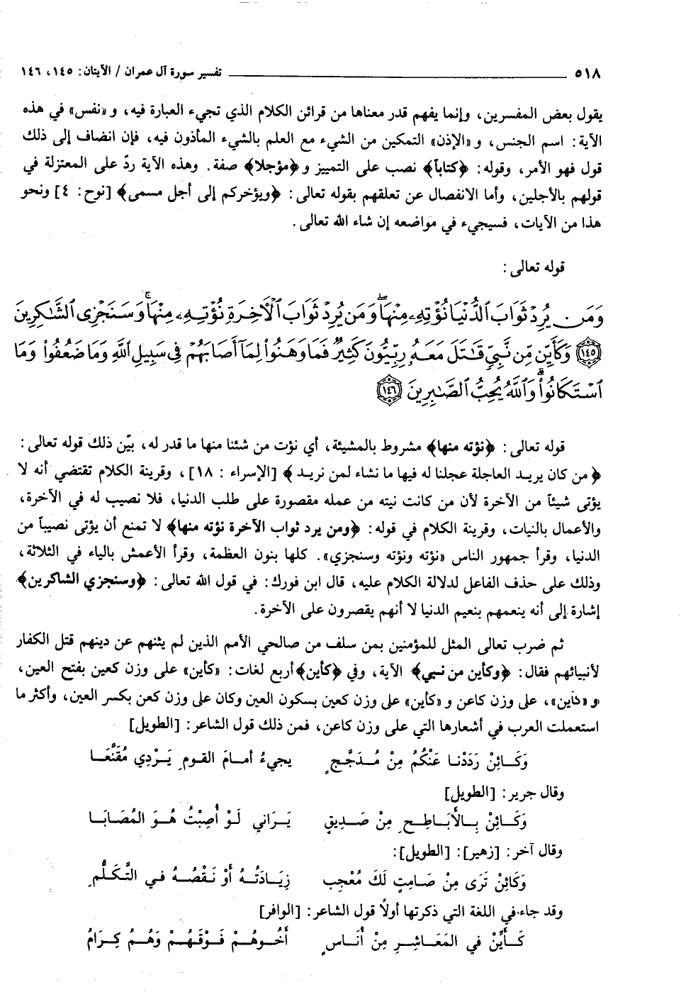 ثم ضرب تعالى المثل للمؤمنين بمن سلف من صالحي الأمم الذين لم يثنهم عن دينهم قتل الكفار لأنبيائهم فقال: وَكَأَيِّنْ مِنْ نَبِيٍّ الآية، وفي كَأَيِّنْ أربع لغات: «كأين» على وزن كعين بفتح العين، و «كأين» ، على وزن كاعن و «كأين» على وزن كعين بسكون العين وكان على وزن كعن بكسر العين، وأكثر ما استعملت العرب في أشعارها التي على وزن كاعن، فمن ذلك قول الشاعر: [الطويل]