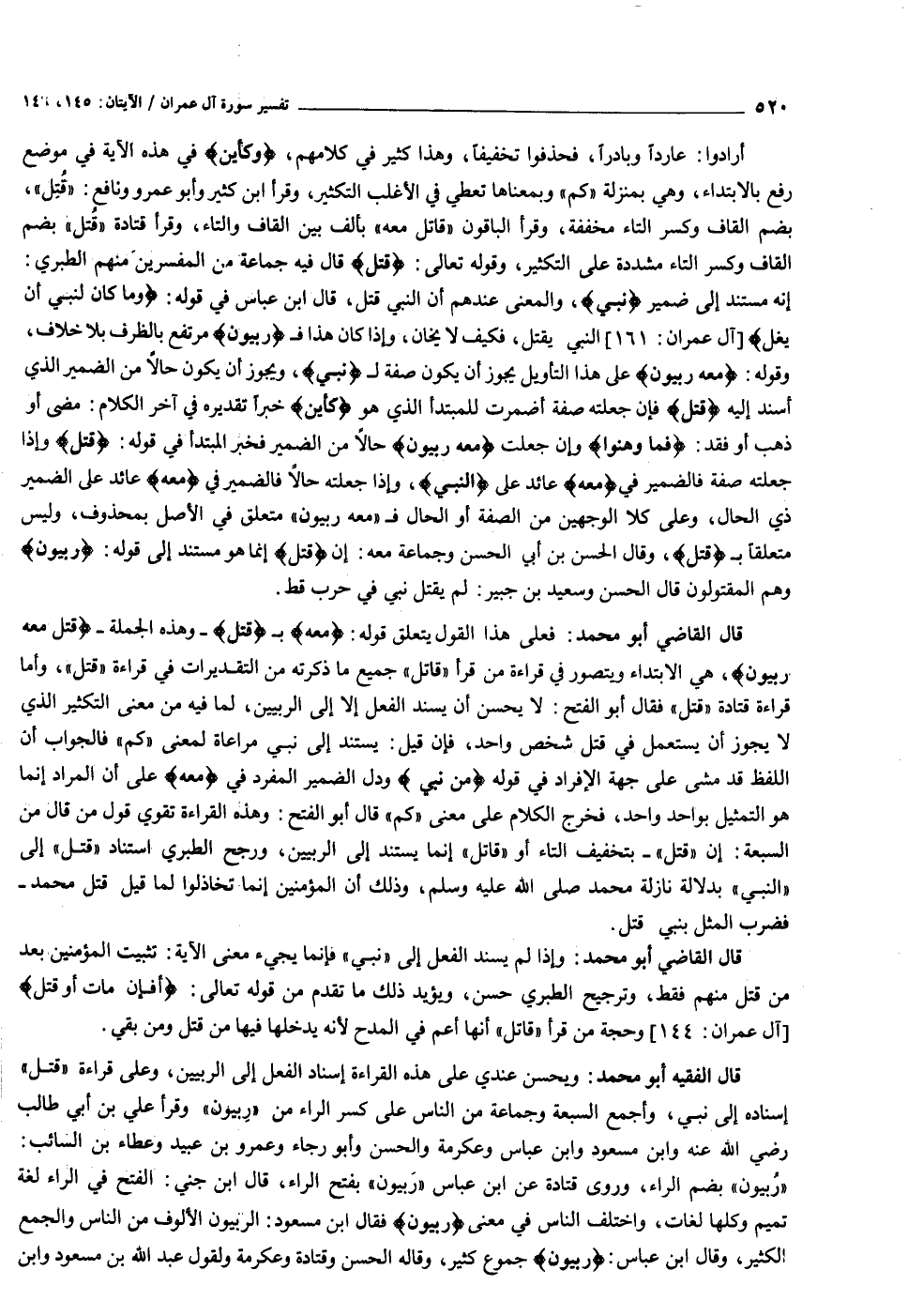 قال الفقيه أبو محمد: ويحسن عندي على هذه القراءة إسناد الفعل إلى الربيين، وعلى قراءة «قتل» إسناده إلى نبي، وأجمع السبعة وجماعة من الناس على كسر الراء من «ربيون» وقرأ علي بن أبي طالب رضي الله عنه وابن مسعود وابن عباس وعكرمة والحسن وأبو رجاء وعمرو بن عبيد وعطاء بن السائب: