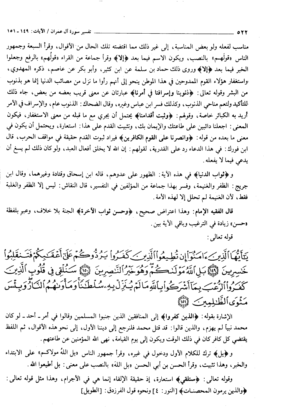 يا أَيُّهَا الَّذِينَ آمَنُوا إِنْ تُطِيعُوا الَّذِينَ كَفَرُوا يَرُدُّوكُمْ عَلى أَعْقابِكُمْ فَتَنْقَلِبُوا خاسِرِينَ (١٤٩) بَلِ اللَّهُ مَوْلاكُمْ وَهُوَ خَيْرُ النَّاصِرِينَ (١٥٠) سَنُلْقِي فِي قُلُوبِ الَّذِينَ كَفَرُوا الرُّعْبَ بِما أَشْرَكُوا بِاللَّهِ ما لَمْ يُنَزِّلْ بِهِ سُلْطاناً وَمَأْواهُمُ النَّارُ وَبِئْسَ مَثْوَى الظَّالِمِينَ (١٥١)