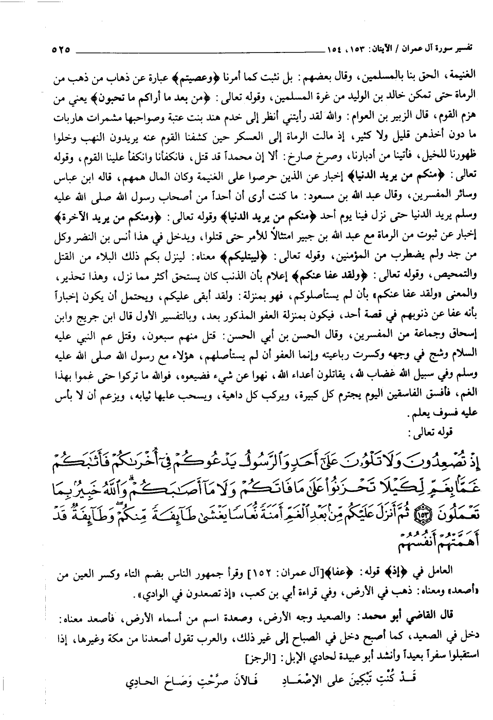 إِذْ تُصْعِدُونَ وَلا تَلْوُونَ عَلى أَحَدٍ وَالرَّسُولُ يَدْعُوكُمْ فِي أُخْراكُمْ فَأَثابَكُمْ غَمًّا بِغَمٍّ لِكَيْلا تَحْزَنُوا عَلى ما فاتَكُمْ وَلا ما أَصابَكُمْ وَاللَّهُ خَبِيرٌ بِما تَعْمَلُونَ (١٥٣) ثُمَّ أَنْزَلَ عَلَيْكُمْ مِنْ بَعْدِ الْغَمِّ أَمَنَةً نُعاساً يَغْشى طائِفَةً مِنْكُمْ وَطائِفَةٌ قَدْ أَهَمَّتْهُمْ أَنْفُسُهُمْ يَظُنُّونَ بِاللَّهِ غَيْرَ الْحَقِّ ظَنَّ الْجاهِلِيَّةِ يَقُولُونَ هَلْ لَنا مِنَ الْأَمْرِ مِنْ شَيْءٍ قُلْ إِنَّ الْأَمْرَ كُلَّهُ لِلَّهِ يُخْفُونَ فِي أَنْفُسِهِمْ ما لا يُبْدُونَ لَكَ يَقُولُونَ لَوْ كانَ لَنا مِنَ الْأَمْرِ شَيْءٌ ما قُتِلْنا هاهُنا قُلْ لَوْ كُنْتُمْ فِي بُيُوتِكُمْ لَبَرَزَ الَّذِينَ كُتِبَ عَلَيْهِمُ الْقَتْلُ إِلى مَضاجِعِهِمْ وَلِيَبْتَلِيَ اللَّهُ ما فِي صُدُورِكُمْ وَلِيُمَحِّصَ ما فِي قُلُوبِكُمْ وَاللَّهُ عَلِيمٌ بِذاتِ الصُّدُورِ (١٥٤)