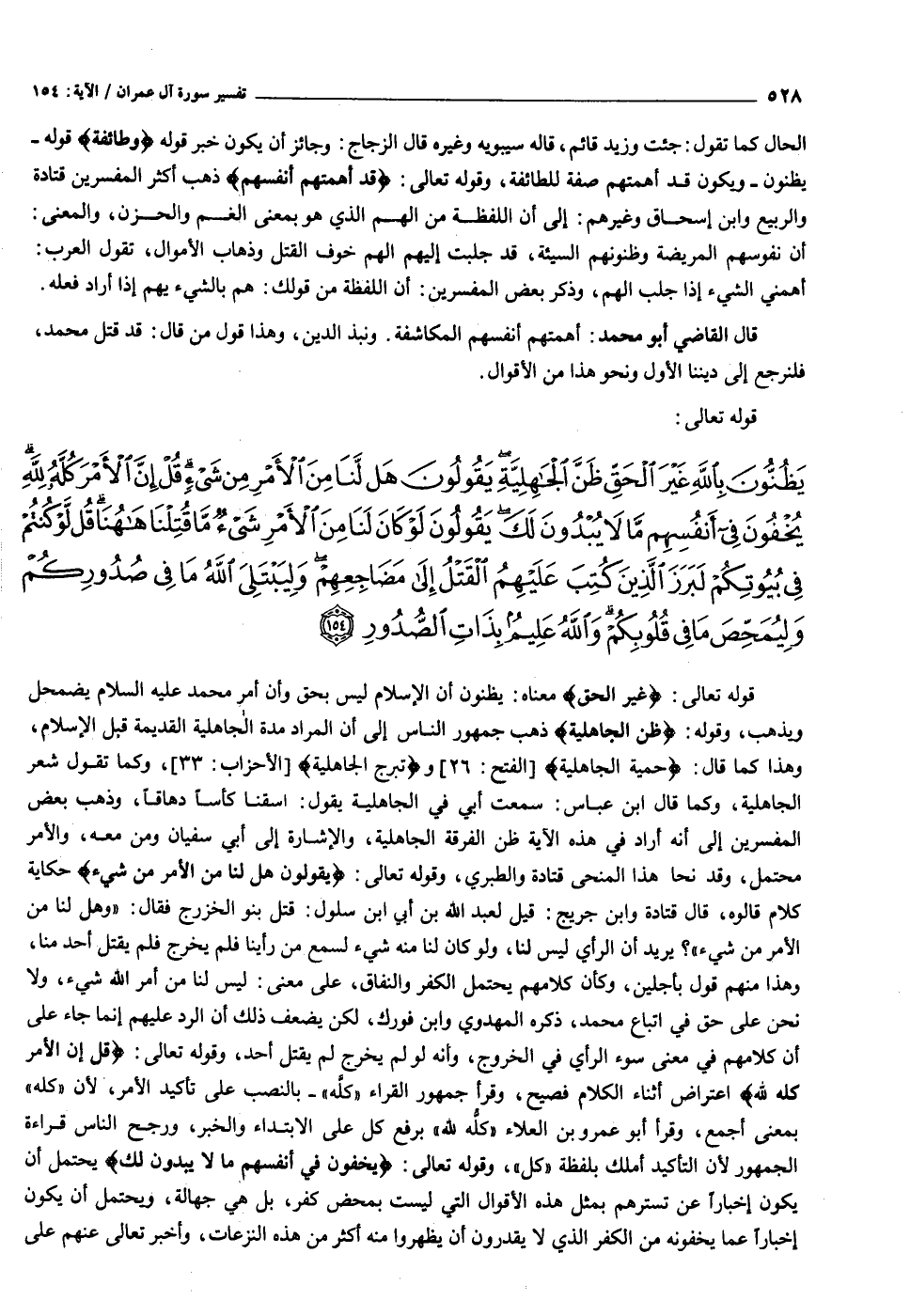 قوله تعالى: غَيْرَ الْحَقِّ معناه: يظنون أن الإسلام ليس بحق وأن أمر محمد عليه السلام يضمحل ويذهب، وقوله: ظَنَّ الْجاهِلِيَّةِ ذهب جمهور الناس إلى أن المراد مدة الجاهلية القديمة قبل الإسلام، وهذا كما قال: حَمِيَّةَ الْجاهِلِيَّةِ [الفتح: ٢٦] وتَبَرُّجَ الْجاهِلِيَّةِ [الأحزاب: ٣٣] ، وكما تقول شعر الجاهلية، وكما قال ابن عباس: سمعت أبي في الجاهلية يقول: اسقنا كأسا دهاقا، وذهب بعض المفسرين إلى أنه أراد في هذه الآية ظن الفرقة الجاهلية، والإشارة إلى أبي سفيان ومن معه، والأمر محتمل، وقد نحا هذا المنحى قتادة والطبري، وقوله تعالى: يَقُولُونَ هَلْ لَنا مِنَ الْأَمْرِ مِنْ شَيْءٍ حكاية كلام قالوه، قال قتادة وابن جريج: قيل لعبد الله بن أبي ابن سلول: قتل بنو الخزرج فقال: «وهل لنا من الأمر من شيء» ؟ يريد أن الرأي ليس لنا، ولو كان لنا منه شيء لسمع من رأينا فلم يخرج فلم يقتل أحد منا، وهذا منهم قول بأجلين، وكأن كلامهم يحتمل الكفر والنفاق، على معنى: ليس لنا من أمر الله شيء، ولا نحن على حق في اتباع محمد، ذكره المهدوي وابن فورك، لكن يضعف ذلك أن الرد عليهم إنما جاء على أن كلامهم في معنى سوء الرأي في الخروج، وأنه لو لم يخرج لم يقتل أحد، وقوله تعالى: قُلْ إِنَّ الْأَمْرَ كُلَّهُ لِلَّهِ اعتراض أثناء الكلام فصيح، وقرأ جمهور القراء «كلّه» - بالنصب على تأكيد الأمر، لأن «كله» بمعنى أجمع، وقرأ أبو عمرو بن العلاء «كلّه لله» برفع كل على الابتداء والخبر، ورجح الناس قراءة الجمهور لأن التأكيد أملك بلفظة «كل» ، وقوله تعالى: يُخْفُونَ فِي أَنْفُسِهِمْ ما لا يُبْدُونَ لَكَ يحتمل أن يكون إخبارا عن تسترهم بمثل هذه الأقوال التي ليست بمحض كفر، بل هي جهالة، ويحتمل أن يكون إخبارا عما يخفونه من الكفر الذي لا يقدرون أن يظهروا منه أكثر من هذه النزعات، وأخبر تعالى عنهم على