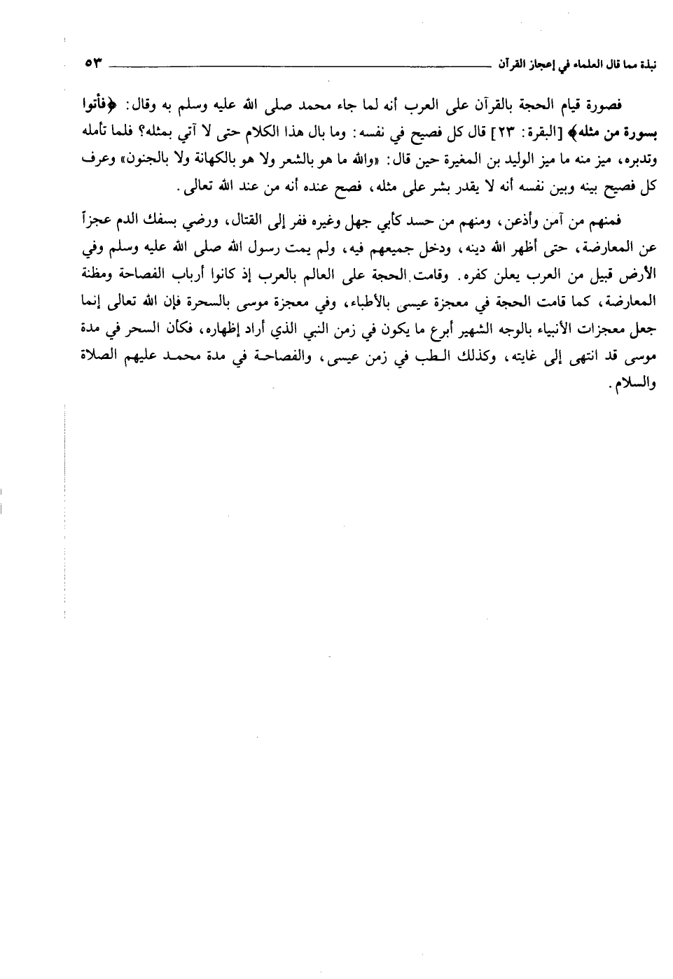 فصورة قيام الحجة بالقرآن على العرب أنه لما جاء محمد صلى الله عليه وسلم به وقال: فَأْتُوا بِسُورَةٍ مِنْ مِثْلِهِ [البقرة: ٢٣] قال كل فصيح في نفسه: وما بال هذا الكلام حتى لا آتي بمثله؟ فلما تأمله وتدبره، ميز منه ما ميز الوليد بن المغيرة حين قال: «والله ما هو بالشعر ولا هو بالكهانة ولا بالجنون» وعرف كل فصيح بينه وبين نفسه أنه لا يقدر بشر على مثله، فصح عنده أنه من عند الله تعالى.