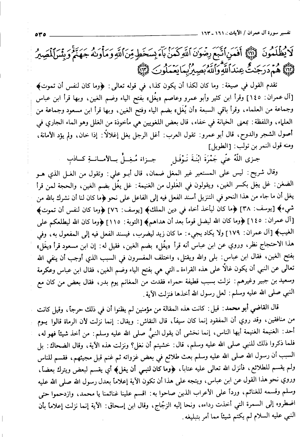 وَما كانَ لِنَبِيٍّ أَنْ يَغُلَّ وَمَنْ يَغْلُلْ يَأْتِ بِما غَلَّ يَوْمَ الْقِيامَةِ ثُمَّ تُوَفَّى كُلُّ نَفْسٍ ما كَسَبَتْ وَهُمْ لا يُظْلَمُونَ (١٦١) أَفَمَنِ اتَّبَعَ رِضْوانَ اللَّهِ كَمَنْ باءَ بِسَخَطٍ مِنَ اللَّهِ وَمَأْواهُ جَهَنَّمُ وَبِئْسَ الْمَصِيرُ (١٦٢) هُمْ دَرَجاتٌ عِنْدَ اللَّهِ وَاللَّهُ بَصِيرٌ بِما يَعْمَلُونَ (١٦٣)