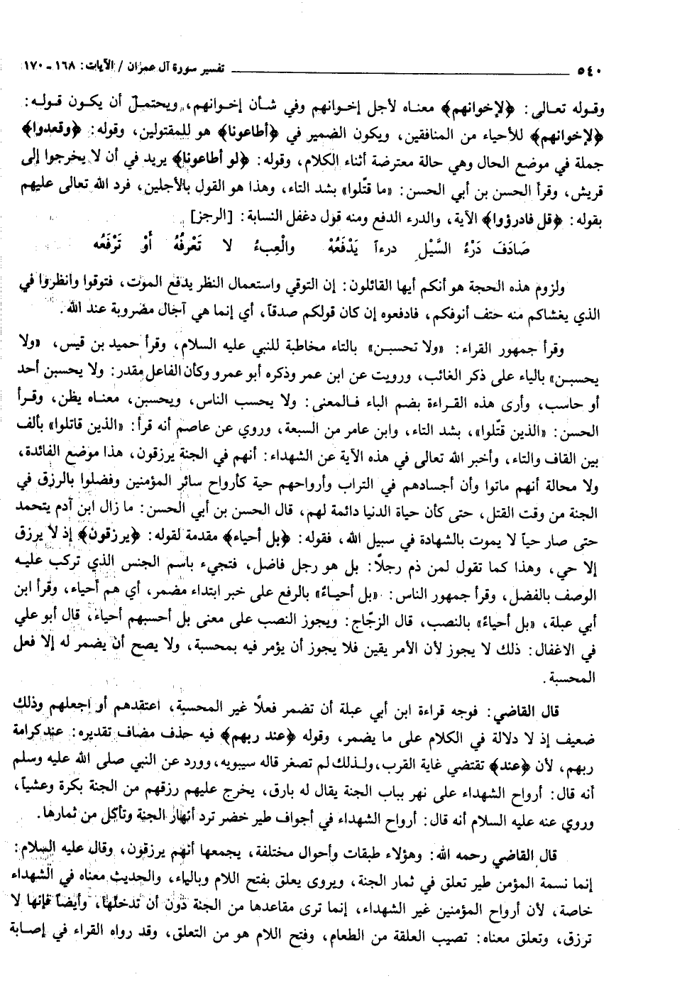 وقرأ جمهور القراء: «ولا تحسبن» بالتاء مخاطبة للنبي عليه السلام، وقرأ حميد بن قيس، «ولا يحسبن» بالياء على ذكر الغائب، ورويت عن ابن عمر وذكره أبو عمرو وكأن الفاعل مقدر: ولا يحسبن أحد أو حاسب، وأرى هذه القراءة بضم الباء فالمعنى: ولا يحسب الناس، ويحسبن، معناه يظن، وقرأ الحسن: «الذين قتّلوا» ، بشد التاء، وابن عامر من السبعة، وروي عن عاصم أنه قرأ: «الذين قاتلوا» بألف بين القاف والتاء، وأخبر الله تعالى في هذه الآية عن الشهداء: أنهم في الجنة يرزقون، هذا موضع الفائدة، ولا محالة أنهم ماتوا وأن أجسادهم في التراب وأرواحهم حية كأرواح سائر المؤمنين وفضلوا بالرزق في الجنة من وقت القتل، حتى كأن حياة الدنيا دائمة لهم، قال الحسن بن أبي الحسن: ما زال ابن آدم يتحمد حتى صار حيا لا يموت بالشهادة في سبيل الله، فقوله: بَلْ أَحْياءٌ مقدمة لقوله: يُرْزَقُونَ إذ لا يرزق إلا حي، وهذا كما تقول لمن ذم رجلا: بل هو رجل فاضل، فتجيء باسم الجنس الذي تركب عليه الوصف بالفضل، وقرأ جمهور الناس: «بل أحياء» بالرفع على خبر ابتداء مضمر، أي هم أحياء، وقرأ ابن أبي عبلة، «بل أحياء» بالنصب، قال الزجّاج: ويجوز النصب على معنى بل أحسبهم أحياء، قال أبو علي في الأغفال: ذلك لا يجوز لأن الأمر يقين فلا يجوز أن يؤمر فيه بمحسبة، ولا يصح أن يضمر له إلا فعل المحسبة.
