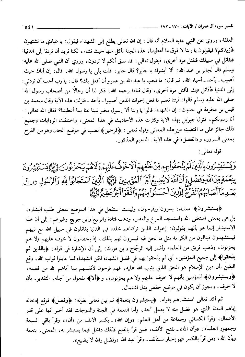 يَسْتَبْشِرُونَ بِنِعْمَةٍ مِنَ اللَّهِ وَفَضْلٍ وَأَنَّ اللَّهَ لا يُضِيعُ أَجْرَ الْمُؤْمِنِينَ (١٧١) الَّذِينَ اسْتَجابُوا لِلَّهِ وَالرَّسُولِ مِنْ بَعْدِ ما أَصابَهُمُ الْقَرْحُ لِلَّذِينَ أَحْسَنُوا مِنْهُمْ وَاتَّقَوْا أَجْرٌ عَظِيمٌ (١٧٢)