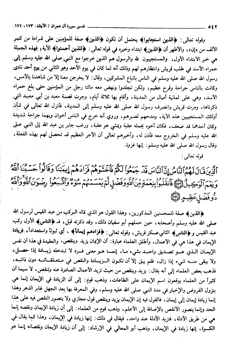 الَّذِينَ قالَ لَهُمُ النَّاسُ إِنَّ النَّاسَ قَدْ جَمَعُوا لَكُمْ فَاخْشَوْهُمْ فَزادَهُمْ إِيماناً وَقالُوا حَسْبُنَا اللَّهُ وَنِعْمَ الْوَكِيلُ (١٧٣) فَانْقَلَبُوا بِنِعْمَةٍ مِنَ اللَّهِ وَفَضْلٍ لَمْ يَمْسَسْهُمْ سُوءٌ وَاتَّبَعُوا رِضْوانَ اللَّهِ وَاللَّهُ ذُو فَضْلٍ عَظِيمٍ (١٧٤)