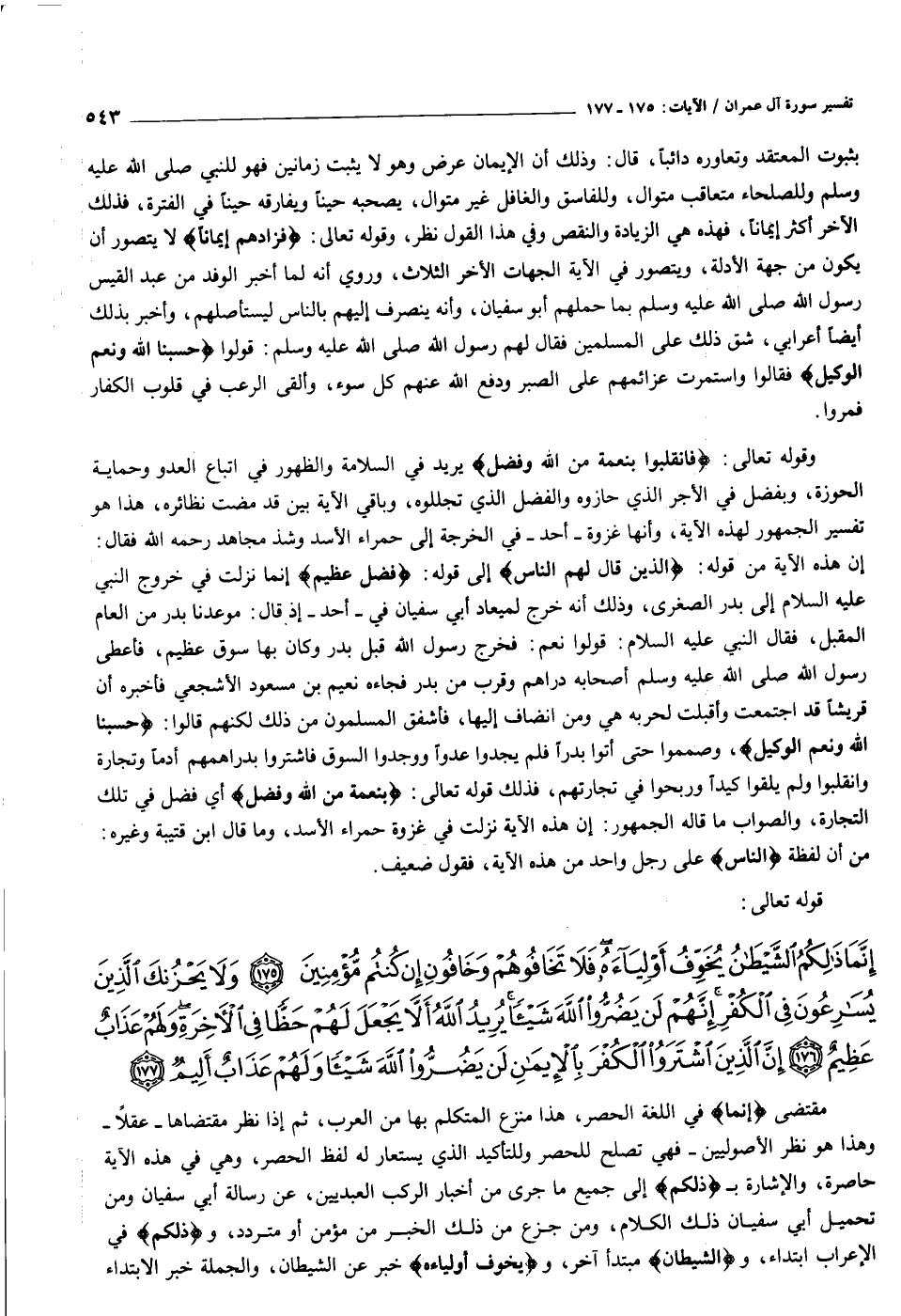 إِنَّما ذلِكُمُ الشَّيْطانُ يُخَوِّفُ أَوْلِياءَهُ فَلا تَخافُوهُمْ وَخافُونِ إِنْ كُنْتُمْ مُؤْمِنِينَ (١٧٥) وَلا يَحْزُنْكَ الَّذِينَ يُسارِعُونَ فِي الْكُفْرِ إِنَّهُمْ لَنْ يَضُرُّوا اللَّهَ شَيْئاً يُرِيدُ اللَّهُ أَلاَّ يَجْعَلَ لَهُمْ حَظًّا فِي الْآخِرَةِ وَلَهُمْ عَذابٌ عَظِيمٌ (١٧٦) إِنَّ الَّذِينَ اشْتَرَوُا الْكُفْرَ بِالْإِيْمانِ لَنْ يَضُرُّوا اللَّهَ شَيْئاً وَلَهُمْ عَذابٌ أَلِيمٌ (١٧٧)