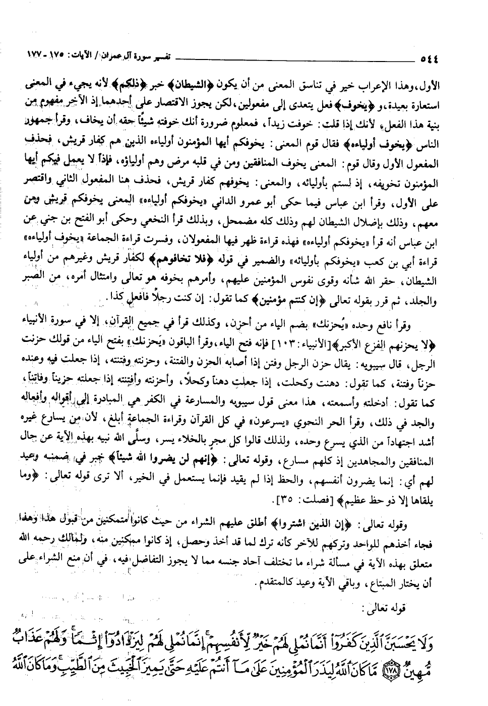 الأول، وهذا الإعراب خير في تناسق المعنى من أن يكون الشَّيْطانُ خبر ذلِكُمُ لأنه يجيء في المعنى استعارة بعيدة، ويُخَوِّفُ فعل يتعدى إلى مفعولين، لكن يجوز الاقتصار على أحدهما إذ الآخر مفهوم من بنية هذا الفعل، لأنك إذا قلت: خوفت زيدا، فمعلوم ضرورة أنك خوفته شيئا حقه أن يخاف، وقرأ جمهور الناس يُخَوِّفُ أَوْلِياءَهُ فقال قوم المعنى: يخوفكم أيها المؤمنون أولياءه الذين هم كفار قريش، فحذف المفعول الأول وقال قوم: المعنى يخوف المنافقين ومن في قلبه مرض وهم أولياؤه، فإذا لا يعمل فيكم أيها المؤمنون تخويفه، إذ لستم بأوليائه، والمعنى: يخوفهم كفار قريش، فحذف هنا المفعول الثاني واقتصر على الأول، وقرأ ابن عباس فيما حكى أبو عمرو الداني «يخوفكم أولياءه» المعنى يخوفكم قريش ومن معهم، وذلك بإضلال الشيطان لهم وذلك كله مضمحل، وبذلك قرأ النخعي وحكى أبو الفتح بن جني عن ابن عباس أنه قرأ «يخوفكم أولياءه» فهذه قراءة ظهر فيها المفعولان، وفسرت قراءة الجماعة «يخوف أولياءه» قراءة أبي بن كعب «يخوفكم بأوليائه» والضمير في قوله فَلا تَخافُوهُمْ لكفار قريش وغيرهم من أولياء الشيطان، حقر الله شأنه وقوى نفوس المؤمنين عليهم، وأمرهم بخوفه هو تعالى وامتثال أمره، من الصبر والجلد، ثم قرر بقوله تعالى إِنْ كُنْتُمْ مُؤْمِنِينَ كما تقول: إن كنت رجلا فافعل كذا.