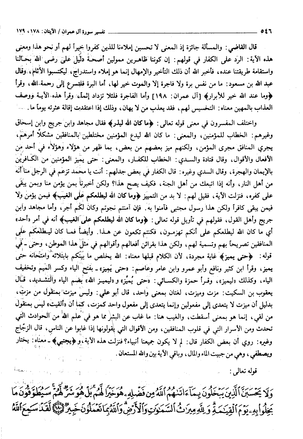 واختلف المفسرون في معنى قوله تعالى: ما كانَ اللَّهُ لِيَذَرَ فقال مجاهد وابن جريج وابن إسحاق وغيرهم: الخطاب للمؤمنين، والمعنى: ما كان الله ليدع المؤمنين مختلطين بالمنافقين مشكلا أمرهم، يجري المنافق مجرى المؤمن، ولكنهم ميز بعضهم من بعض، بما ظهر من هؤلاء وهؤلاء في أحد من الأفعال والأقوال، وقال قتادة والسدي: الخطاب للكفار، والمعنى: حتى يميز المؤمنين من الكافرين بالإيمان والهجرة، وقال السدي وغيره: قال الكفار في بعض جدلهم: أنت يا محمد تزعم في الرجل منا أنه من أهل النار، وأنه إذا اتبعك من أهل الجنة، فكيف يصح هذا؟ ولكن أخبرنا بمن يؤمن منا وبمن يبقى على كفره، فنزلت الآية، فقيل لهم: لا بد من التمييز وَما كانَ اللَّهُ لِيُطْلِعَكُمْ عَلَى الْغَيْبِ فيمن يؤمن ولا فيمن يبقى كافرا ولكن هذا رسول مجتبى فآمنوا به. فإن آمنتم نجوتم وكان لكم أجر، وأما مجاهد وابن جريج وأهل القول، فقولهم في تأويل قوله تعالى: وَما كانَ اللَّهُ لِيُطْلِعَكُمْ عَلَى الْغَيْبِ أنه في أمر «أحد» أي ما كان الله ليطلعكم على أنكم تهزمون، فكنتم تكعون عن هذا. وأيضا فما كان ليطلعكم على المنافقين تصريحا بهم وتسمية لهم، ولكن هذا بقرائن أفعالهم وأقوالهم في مثل هذا الموطن، وحتى- في قوله: حَتَّى يَمِيزَ غاية مجردة، لأن الكلام قبلها معناه: الله يخلص ما بينكم بابتلائه وامتحانه حتى يميز، وقرأ ابن كثير ونافع وأبو عمرو وابن عامر وعاصم: «حتى يميز» - بفتح الياء وكسر الميم وتخفيف الياء، وكذلك «ليميز» ، وقرأ حمزة والكسائي: «حتى يميّز» و «ليميز الله» بضم الياء والتشديد، قال يعقوب بن السكيت: مزت وميزت، لغتان بمعنى واحد، قال أبو علي: وليس ميزت بمنقول من مزت، بدليل أن ميزت لا يتعدى إلى مفعولين وإنما يتعدى إلى مفعول واحد كمزت، كما أن «ألقيت» ليس بمنقول من لقي، إنما هو بمعنى أسقطت، والغيب هنا: ما غاب عن البشر مما هو في علم الله من الحوادث التي تحدث ومن الأسرار التي في قلوب المنافقين، ومن الأقوال التي يقولونها إذا غابوا عن الناس، قال الزجّاج وغيره: روي أن بعض الكفار قال: لم لا يكون جميعنا أنبياء؟ فنزلت هذه الآية، ويَجْتَبِي- معناه: يختار ويصطفي، وهي من جبيت الماء والمال، وباقي الآية بين والله المستعان.