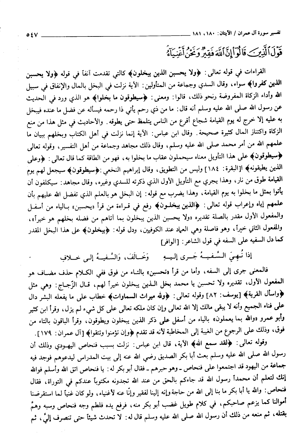 قول الّذين قالوا إنّ الله فقير ونحن أغنياء القراءات في قوله تعالى: وَلا يَحْسَبَنَّ الَّذِينَ يَبْخَلُونَ كالتي تقدمت آنفا في قوله وَلا يَحْسَبَنَّ الَّذِينَ كَفَرُوا سواء، وقال السدي وجماعة من المتأولين: الآية نزلت في البخل بالمال والإنفاق في سبيل الله وأداء الزكاة المفروضة ونحو ذلك، قالوا: ومعنى: سَيُطَوَّقُونَ ما بَخِلُوا هو الذي ورد في الحديث عن رسول الله صلى الله عليه وسلم أنه قال: ما من ذي رحم يأتي ذا رحمه فيسأله عن فضل ما عنده فيبخل به عليه إلا خرج له يوم القيامة شجاع أقرع من الناس يتلمظ حتى يطوقه. والأحاديث في مثل هذا من منع الزكاة واكتناز المال كثيرة صحيحة. وقال ابن عباس: الآية إنما نزلت في أهل الكتاب وبخلهم ببيان ما علمهم الله من أمر محمد صلى الله عليه وسلم، وقال ذلك مجاهد وجماعة من أهل التفسير، وقوله تعالى سَيُطَوَّقُونَ على هذا التأويل معناه سيحملون عقاب ما بخلوا به، فهو من الطاقة كما قال تعالى: وَعَلَى الَّذِينَ يُطِيقُونَهُ [البقرة: ١٨٤] وليس من التطويق، وقال إبراهيم النخعي: سَيُطَوَّقُونَ سيجعل لهم يوم القيامة طوق من نار، وهذا يجري مع التأويل الأول الذي ذكرته للسدي وغيره، وقال مجاهد: سيكلفون أن يأتوا بمثل ما بخلوا به يوم القيامة، وهذا يضرب مع قوله: إن البخل هو بالعلم الذي تفضل الله عليهم بأن علمهم إياه وإعراب قوله تعالى: الَّذِينَ يَبْخَلُونَ رفع في قراءة من قرأ «يحسبن» بالياء من أسفل والمفعول الأول مقدر بالصلة تقديره «ولا يحسبن الذين يبخلون بما آتاهم من فضله بخلهم هو خيرا» ، والمفعول الثاني خيرا، وهو فاصلة وهي العماد عند الكوفيين، ودل قوله: يَبْخَلُونَ على هذا البخل المقدر كما دل السفيه على السفه في قول الشاعر: [الوافر]